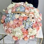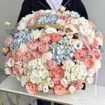 Шикарная и огромная корзина в трендовых оттенках 🤍 С большими гортензиями и пионовидными розами премиальных сортов, с добавлением сортовых диантусов, эустомы и ароматного эвкалипта. Отличный подарок на торжество и просто красивый жест 😉 Используем только качественные и свежие цветы 👍🏻 Доставим вовремя и без хлопот🫡