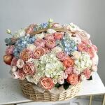 Эвкалипт - 6 шт. Эустома - 3 шт. Гортензия белая - 5 шт. Гортензия голубая - 4 шт. Оазис флористический - 5 шт. Роза эквадор кахала - 7 шт. Диантус сортовой - 15 шт. Роза кустовая джульетта - 10 шт. корзина плетенная большая - 1 шт. Роза кустовая Менсфилд Парк - 8 шт.