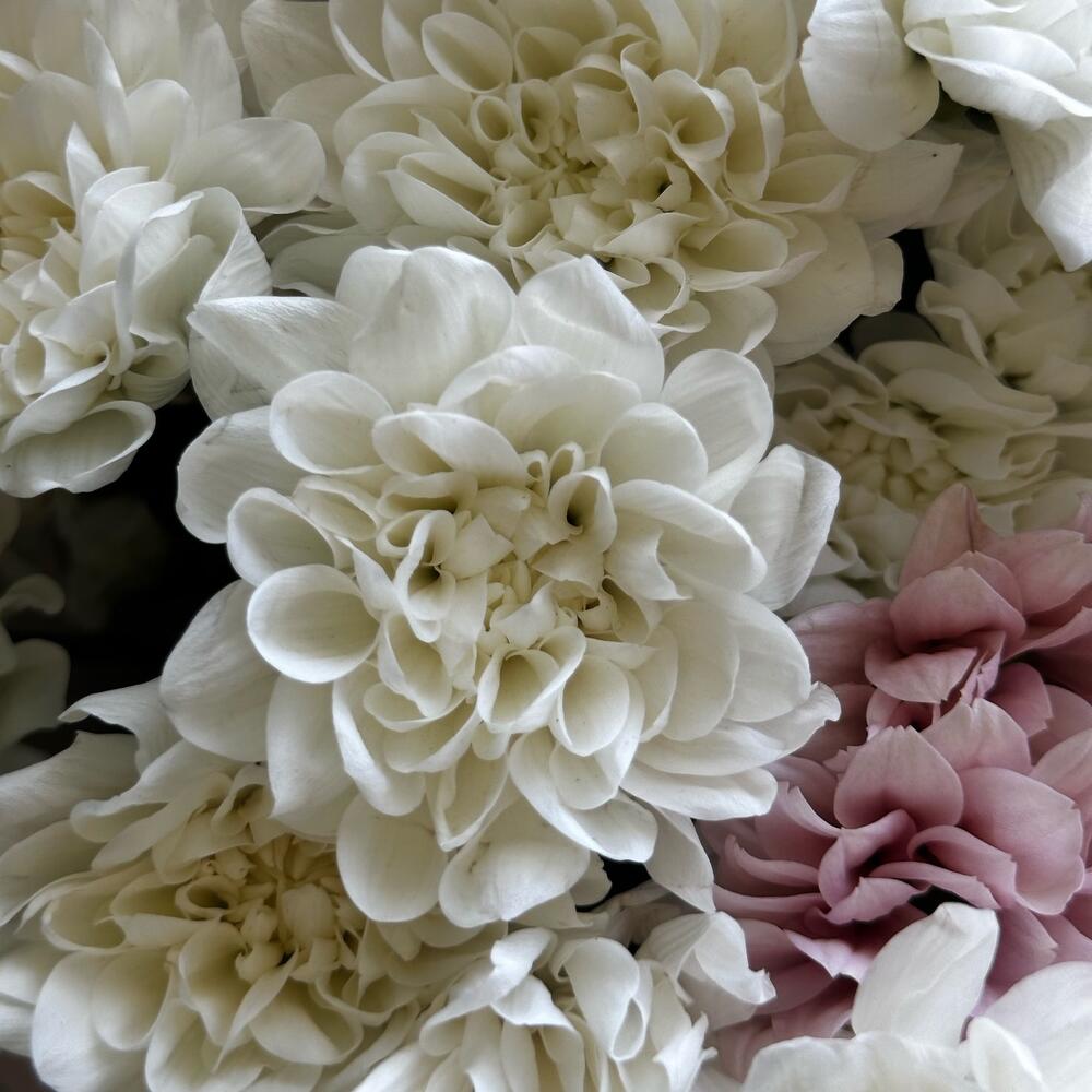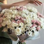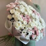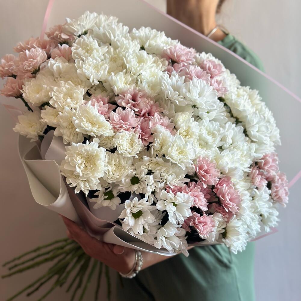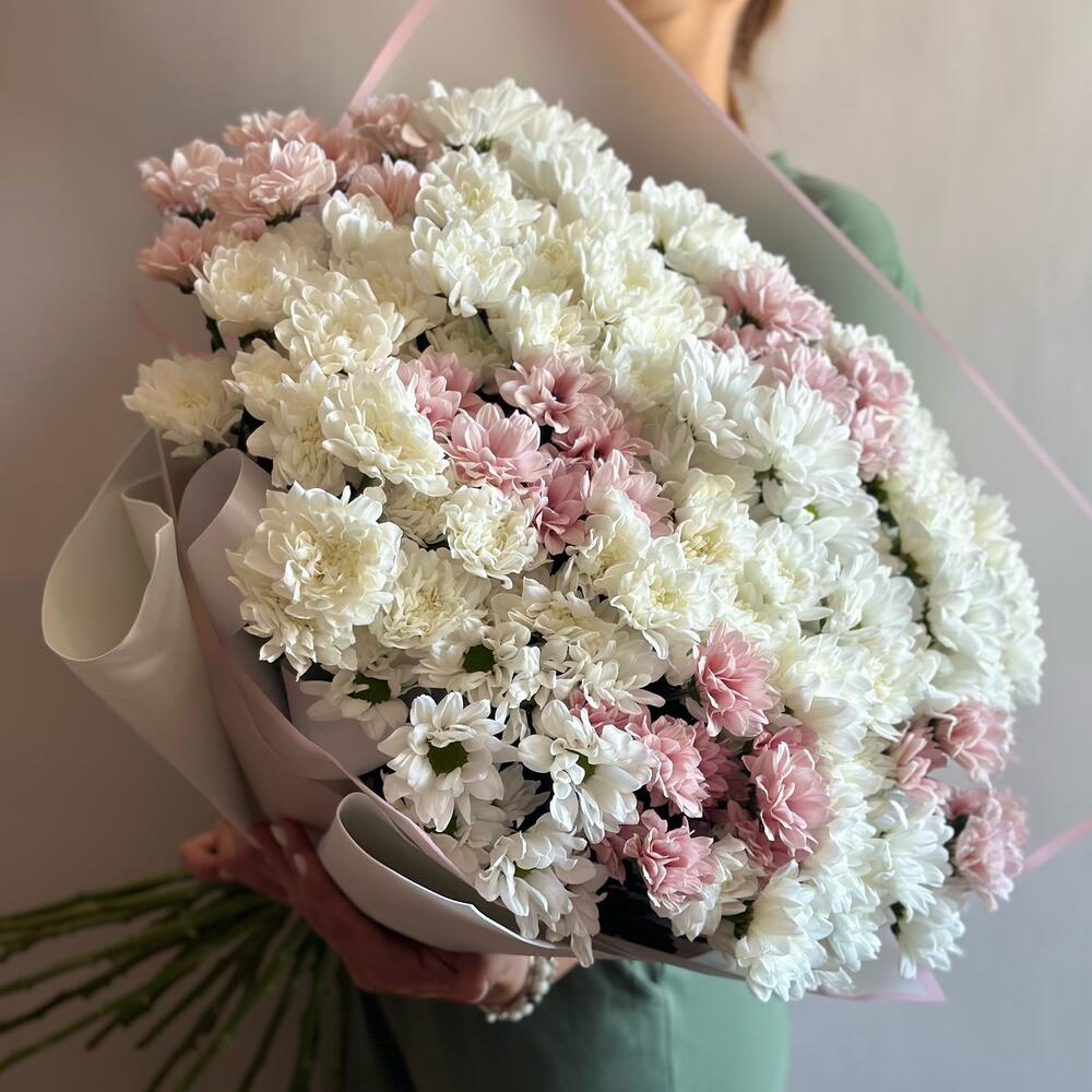 Объемный и пушистый букет из трёх разных сортов кустовых хризантем.