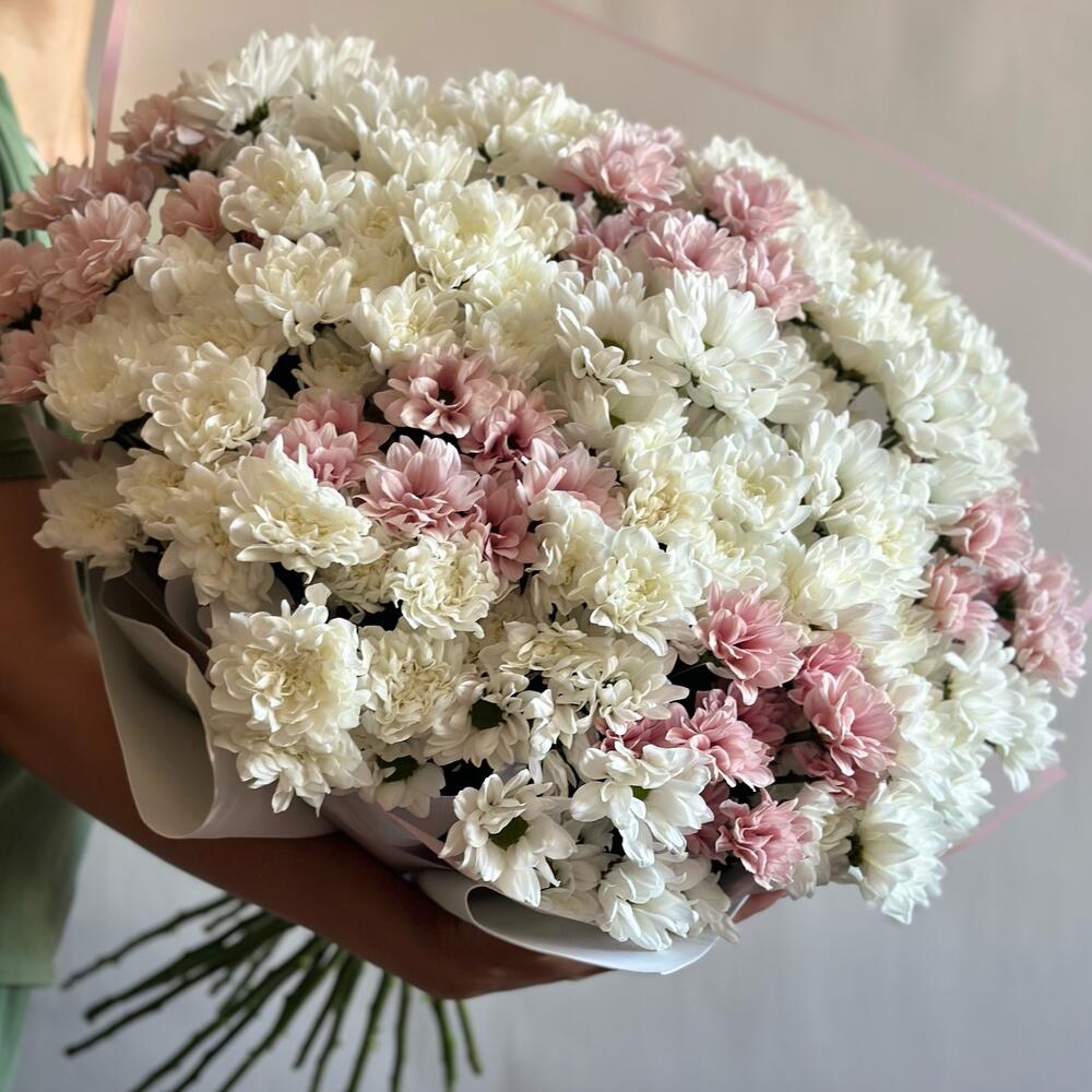 Кустовая хризантема - 19 шт. Упаковка - 1 шт. Атласная лента - 3 шт. Аквапак - 1 шт. Открыточка с вашими пожеланиями - 1 шт.