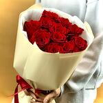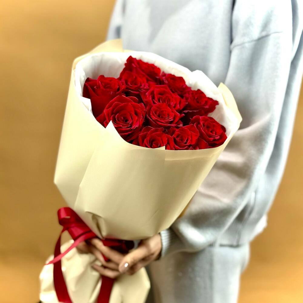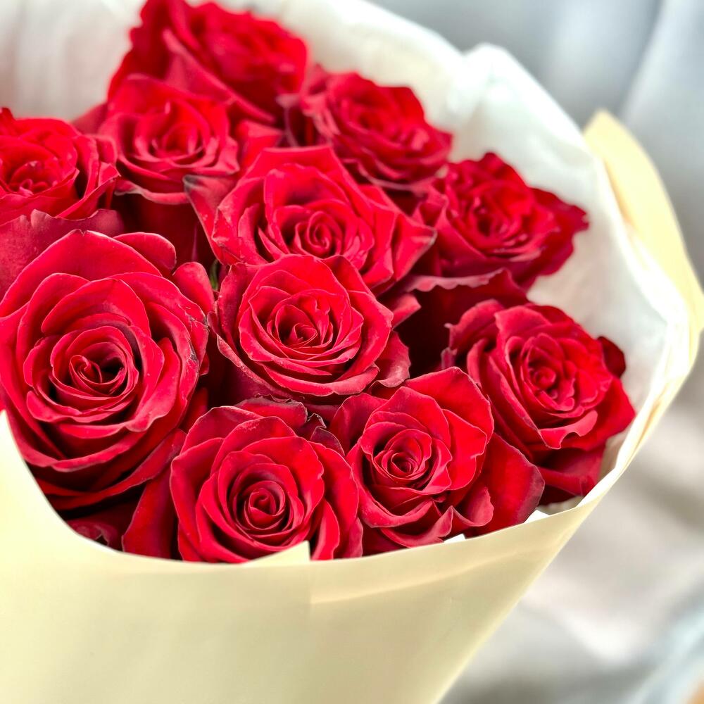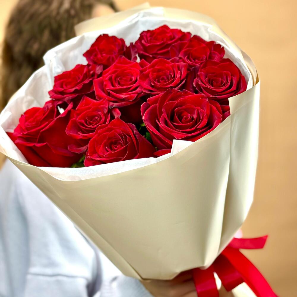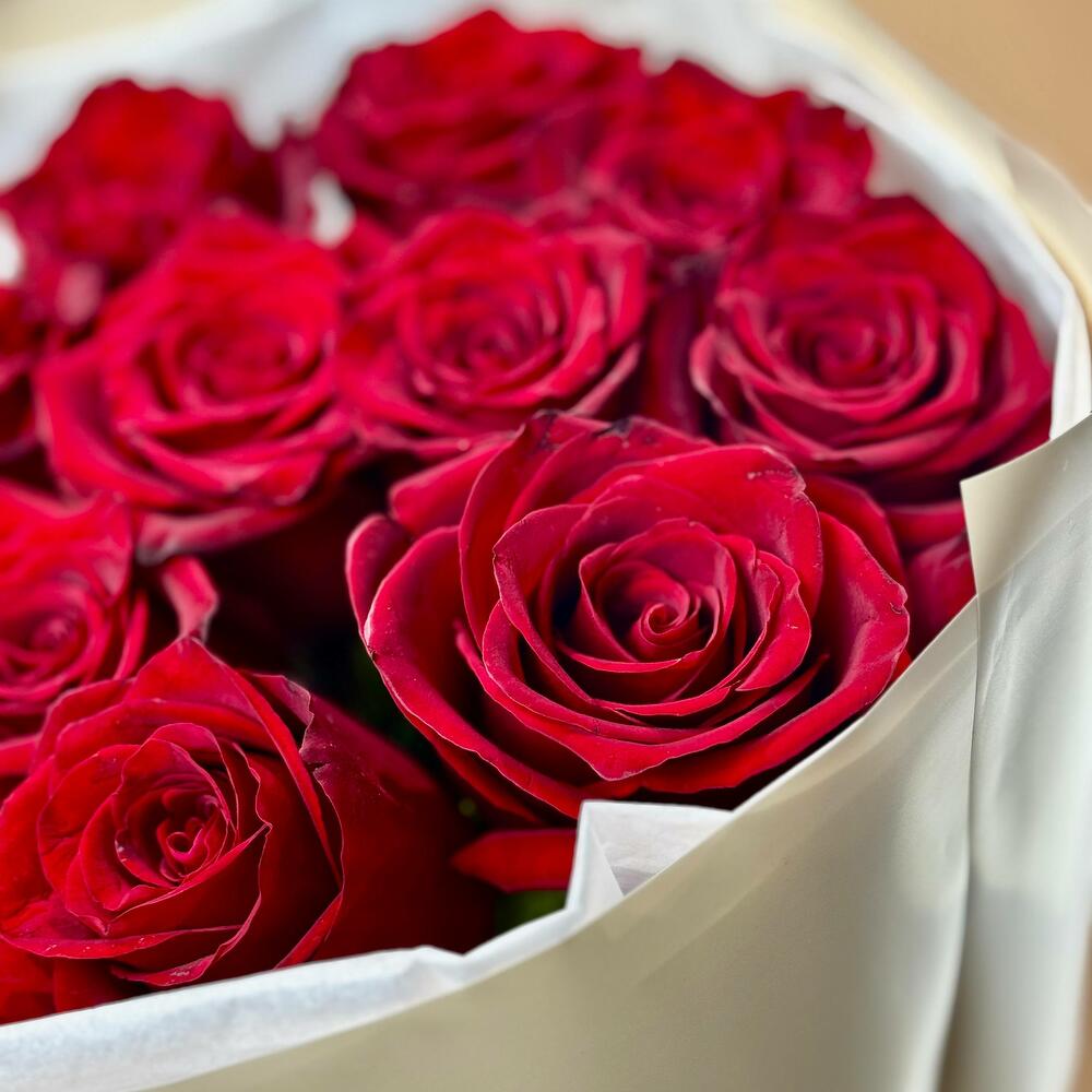 Этот букет из 11 красных роз — воплощение элегантности и страсти. Каждая роза, словно драгоценный камень, сверкает насыщенным алым цветом, создавая ощущение тепла и любви. Бутоны аккуратно собраны в гармоничную композицию, обрамленную нежной белой бумагой, которая подчеркивает их яркость и свежесть. Красная лента, изящно завязанная в бант, добавляет нотку изысканности и завершенности. Этот букет — идеальный символ глубоких чувств и искренней привязанности, способный тронуть сердце и оставить незабываемые впечатления.