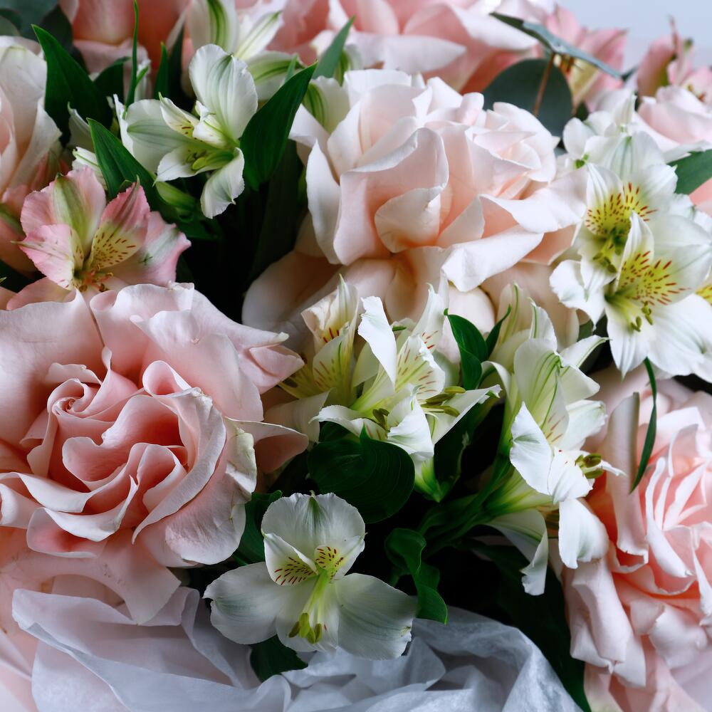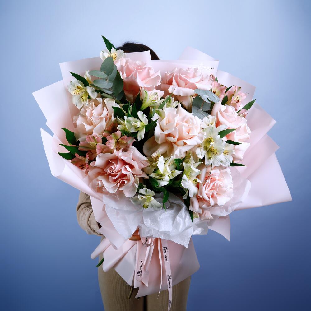 Этот большой букет из французских роз восхищает своей элегантностью и утонченностью. Нежные лепестки роз гармонично сочетаются с эффектными цветами альстромерии, создавая живую палитру оттенков. Эвкалипт добавляет свежести и легкости, наполняя композицию ароматом. Идеальный подарок для особого случая!