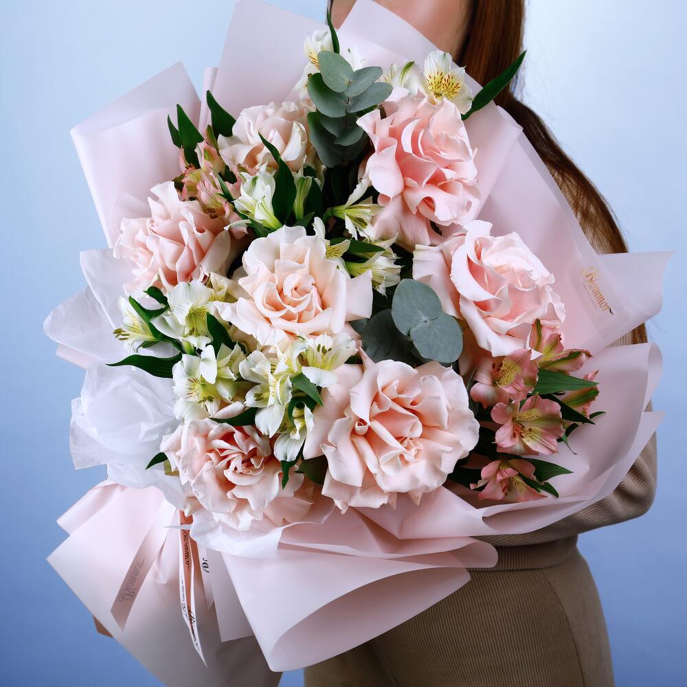 Премиум букет из французских роз с альстромерией и эвкалиптом