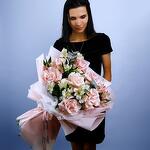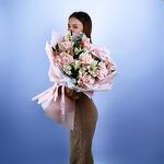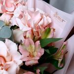 Альстромерия - 6 шт. Писташ - 3 шт. Эвкалипт - 1 шт. Лента атласная - 1 шт. Тишью - 1 шт. Упаковка дизайнерская - 1 шт. роза французская розовая пинк мондиаль - 7 шт.