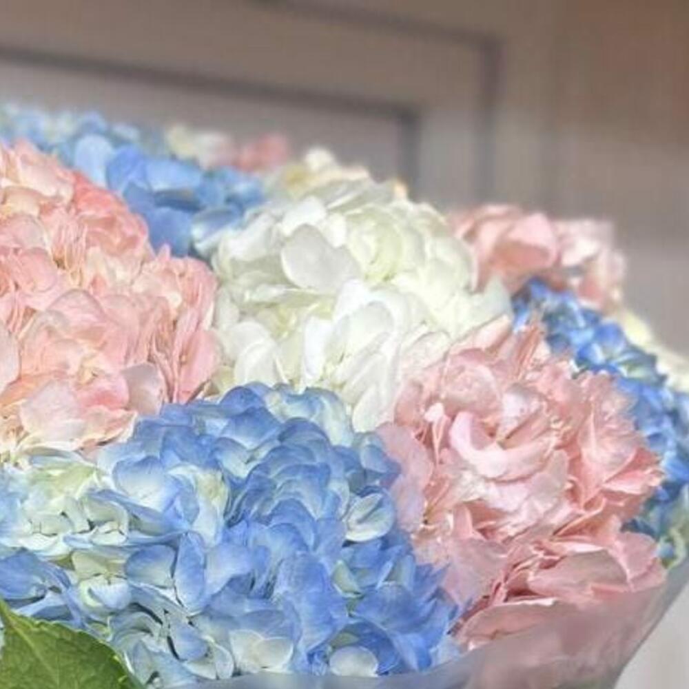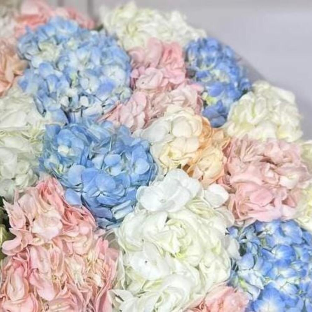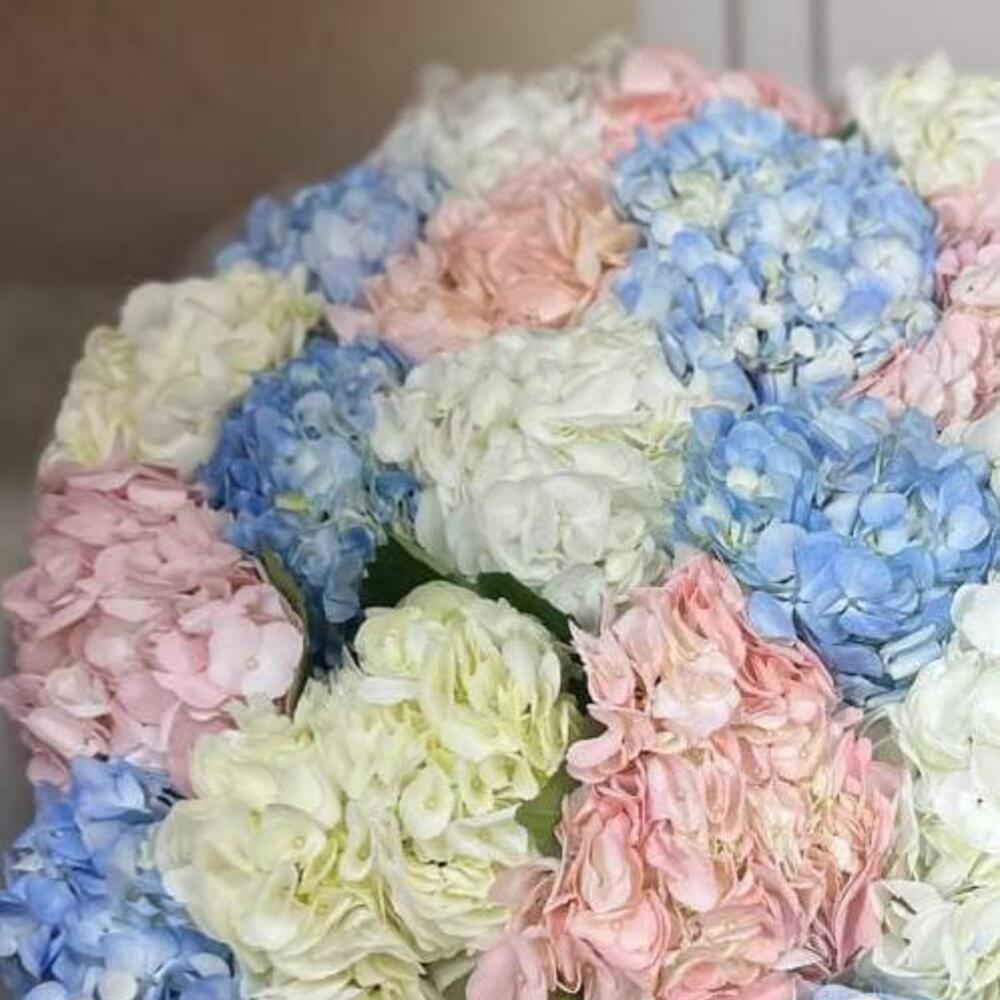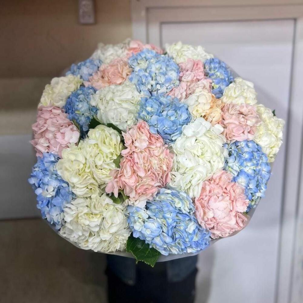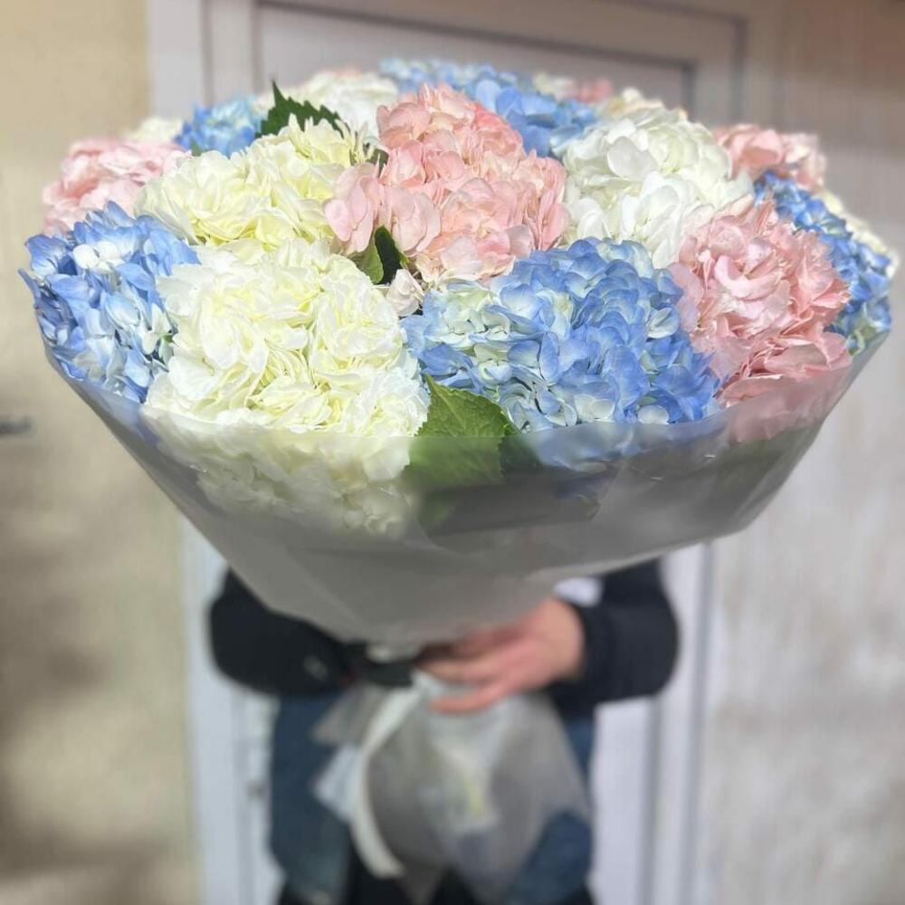 Гортензия - 25 шт. Лента атласная - 1 шт. Открытка - 1 шт. Упаковка дизайнерская - 1 шт. отличное настроение - 1000 шт.