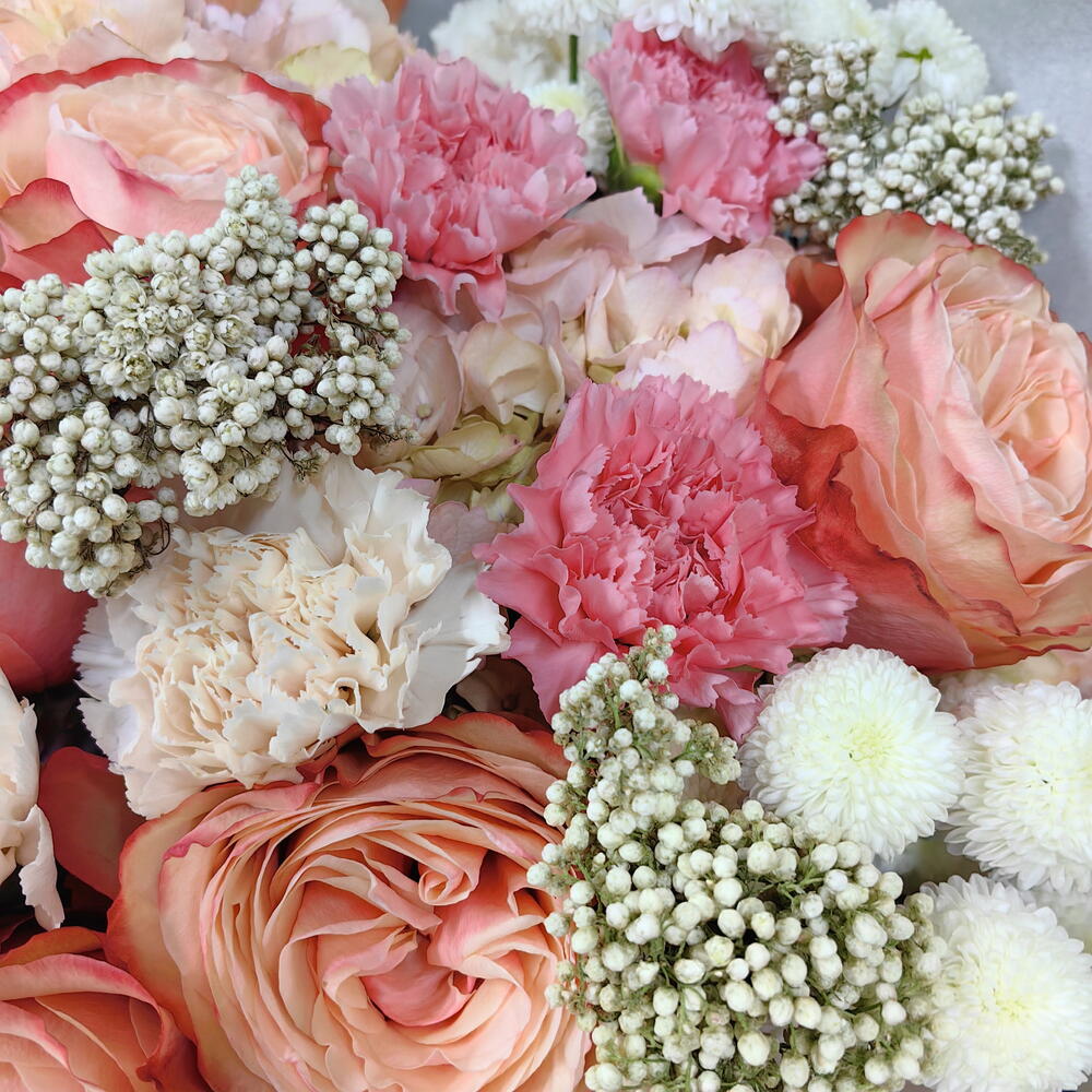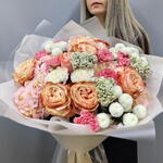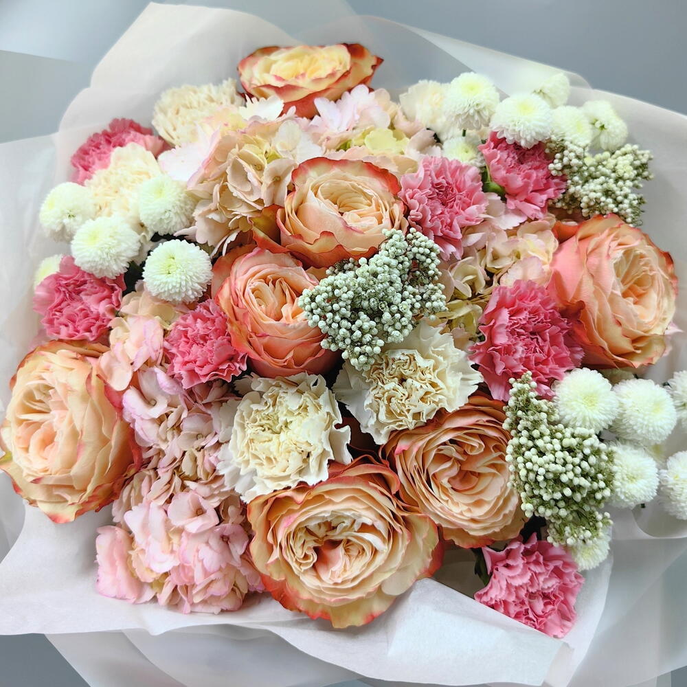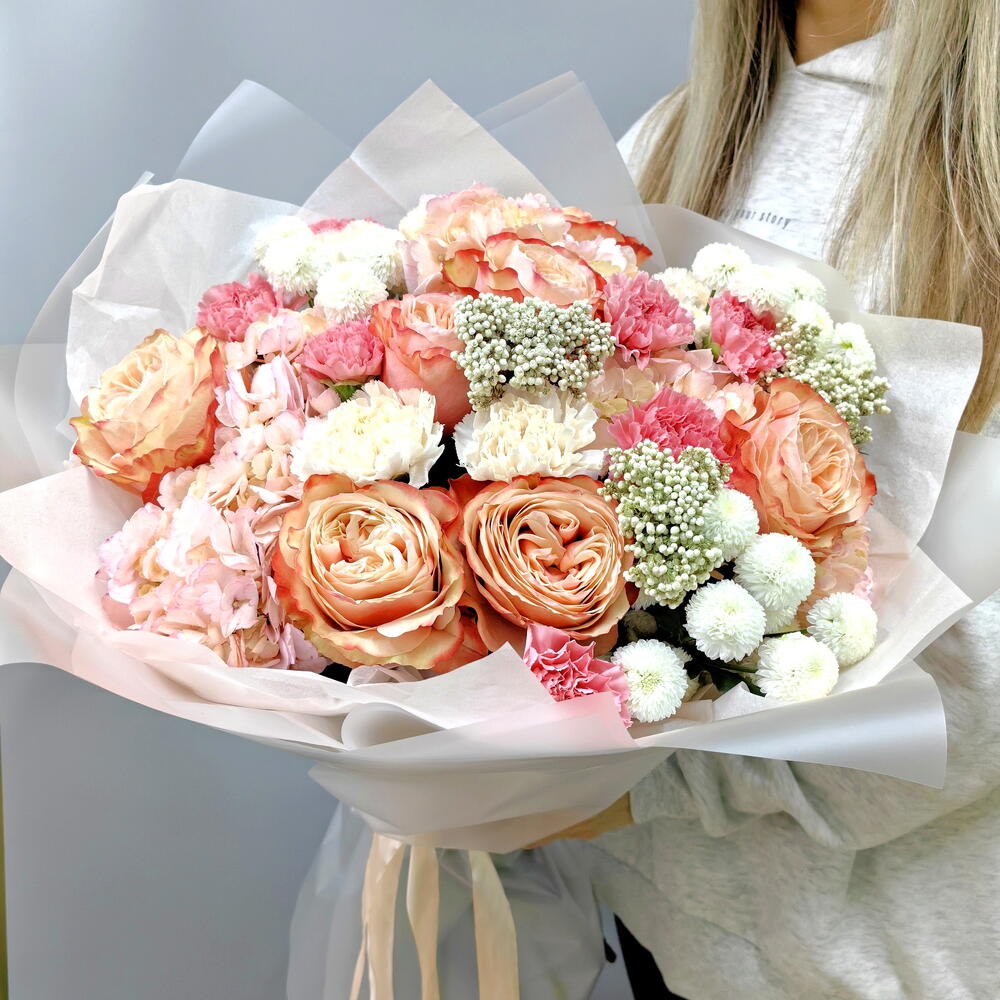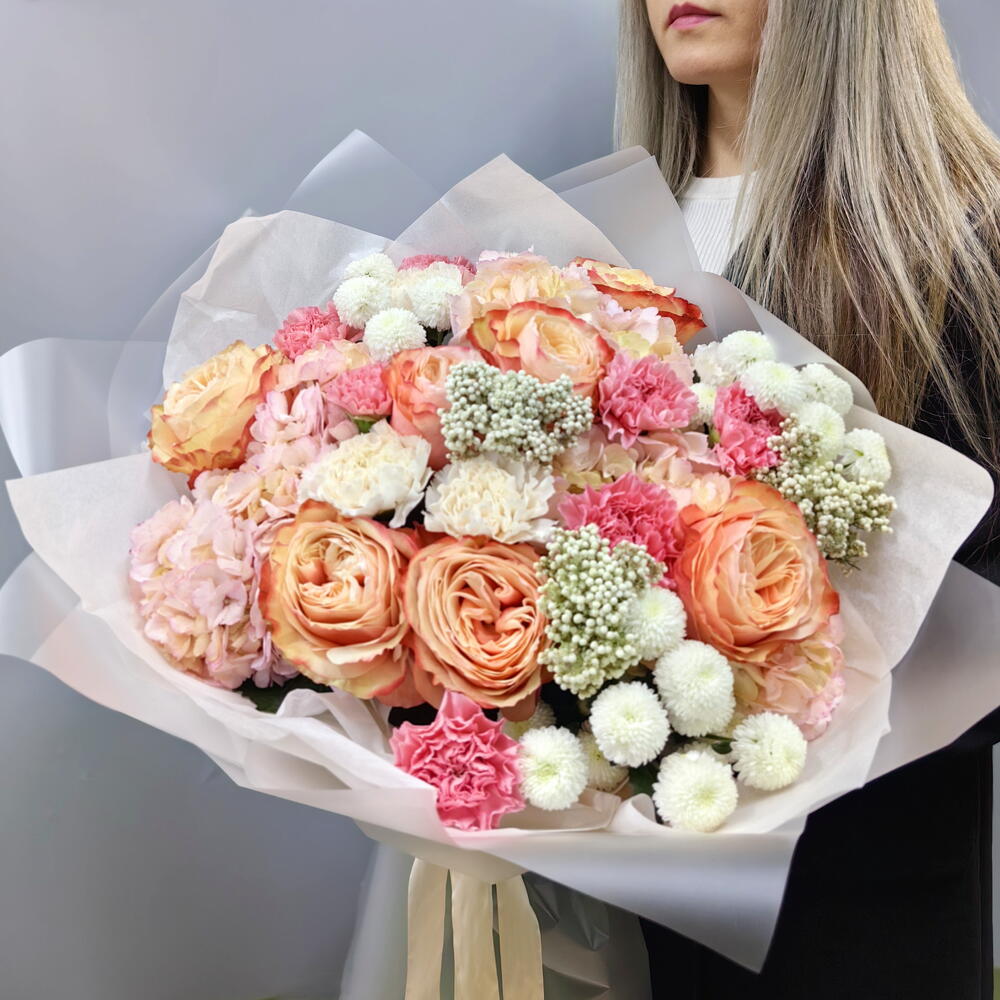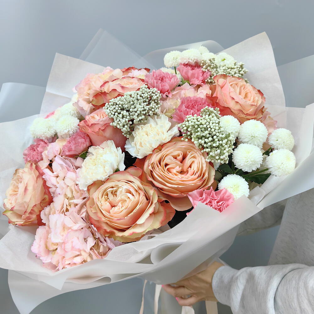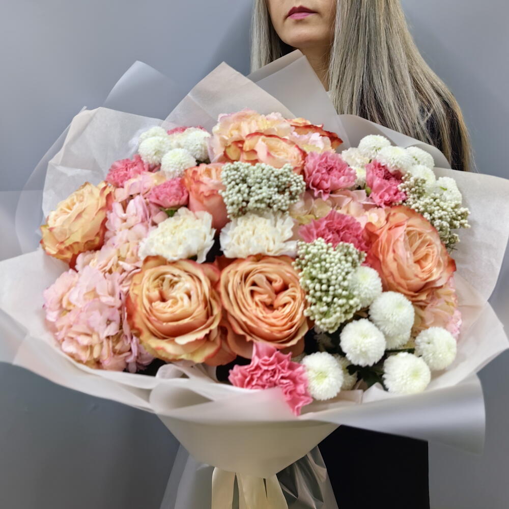 Сборный авторский букет. В составе розовая гортензия, кремовая гвоздика, пионовидные розы, хризантема Сантини. Флористы цветочного салона Май собрали его из свежих цветов, прекрасно сочетающихся в одной композиции. Букет станет отличным подарком, для любимой женщины, мамы, дочери, подойдет на день рождения, юбилей или свадьбу, любое торжество. С букетом вы получите конверт с инструкцией по уходу, как правильно ухаживать за цветами, чтобы продлить их стойкость и кризал.