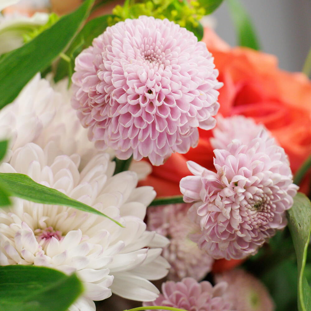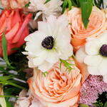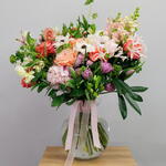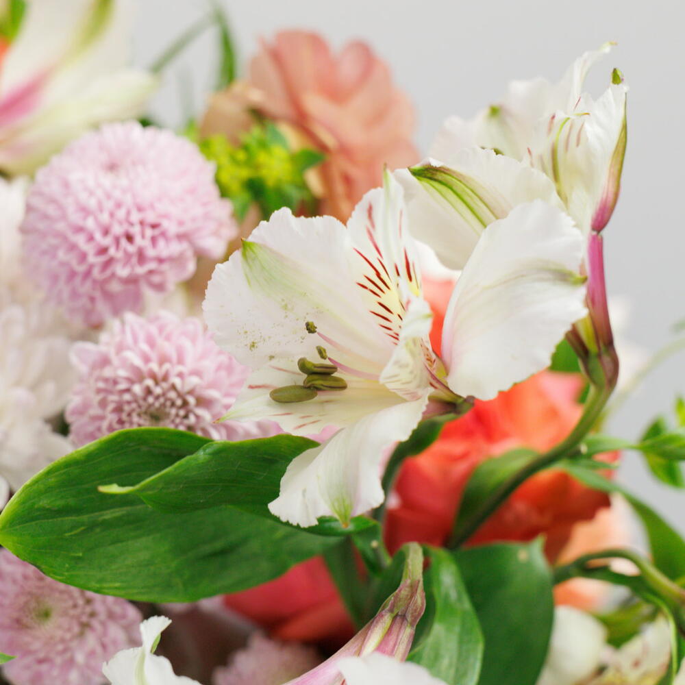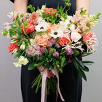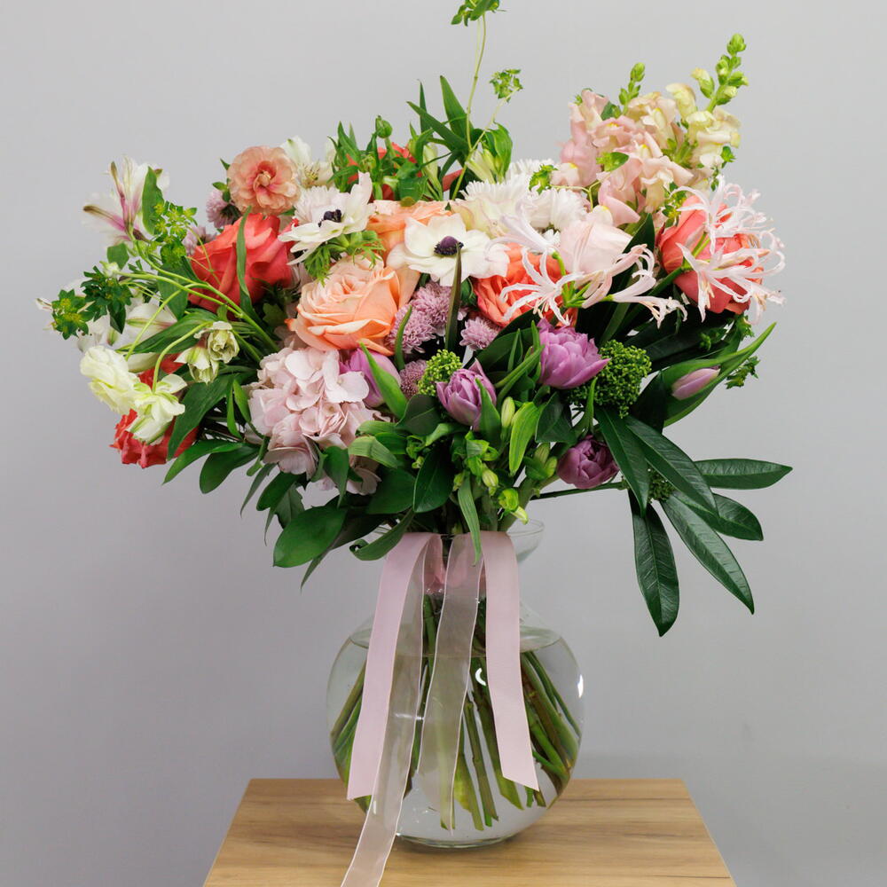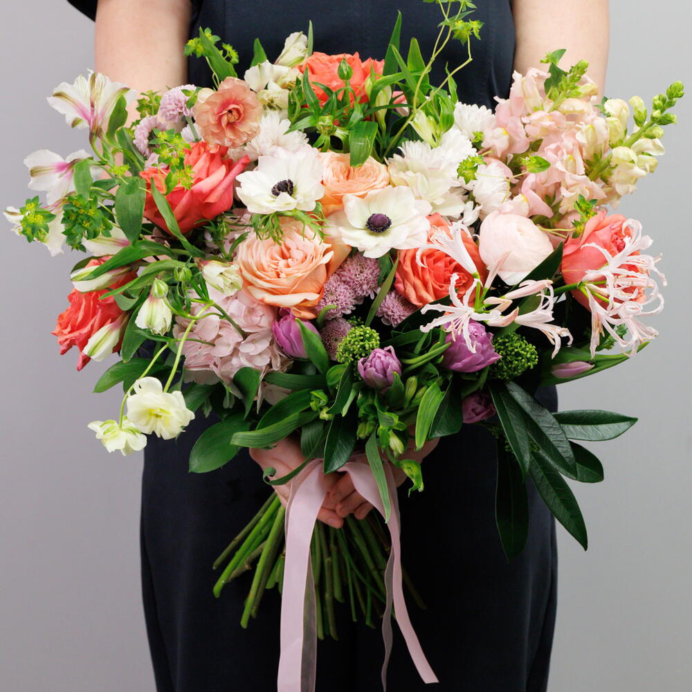 Альстромерия - 6 шт. Анемон - 3 шт. Гортензия - 1 шт. Тюльпан - 3 шт. Хризантема кустовая - 4 шт. Роза - 7 шт. Сантини - 2 шт. Ранункулюс - 3 шт. Антирринум - 2 шт. нерине - 2 шт.