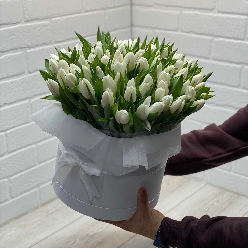 Тюльпан - 101 шт. Лента атласная - 1 шт. Шляпная коробка - 1 шт.