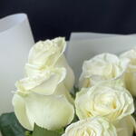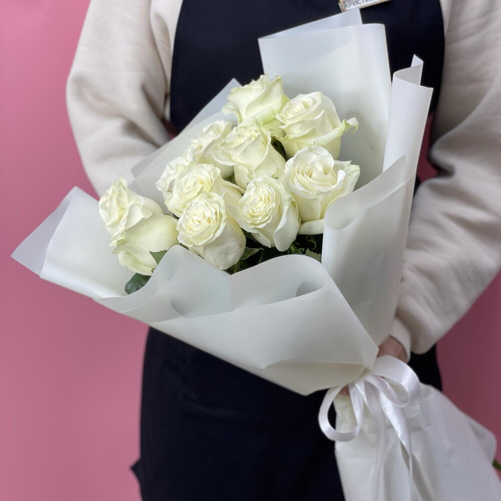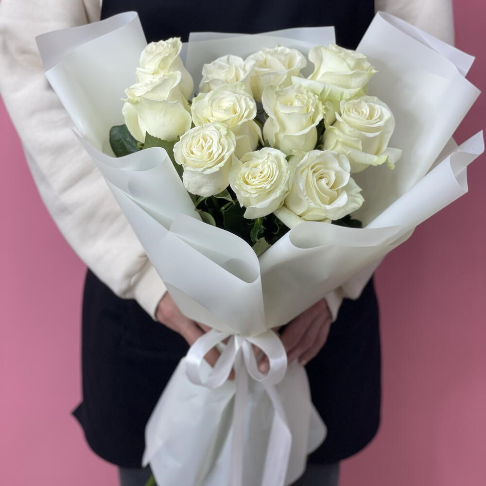 Лента атласная - 1 шт. Упаковка дизайнерская - 1 шт. Роза белая эквадор - 11 шт.
