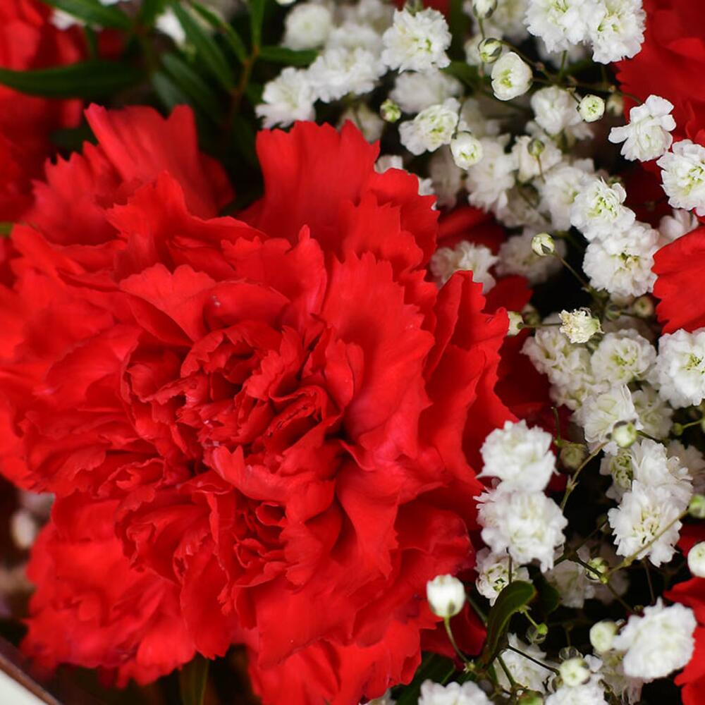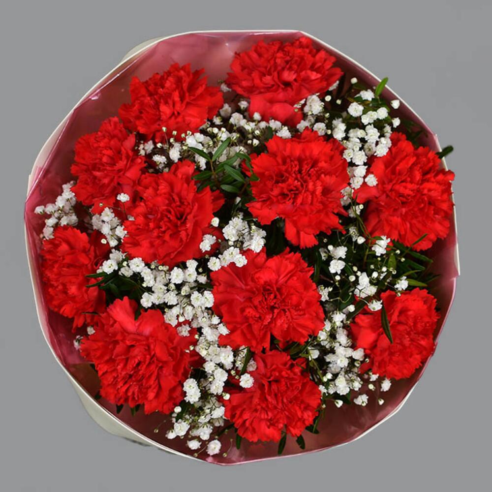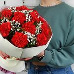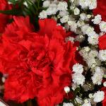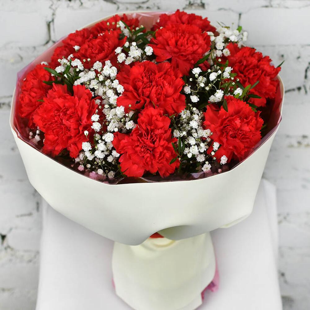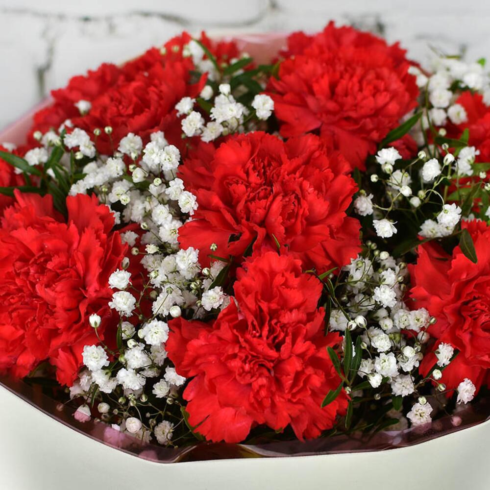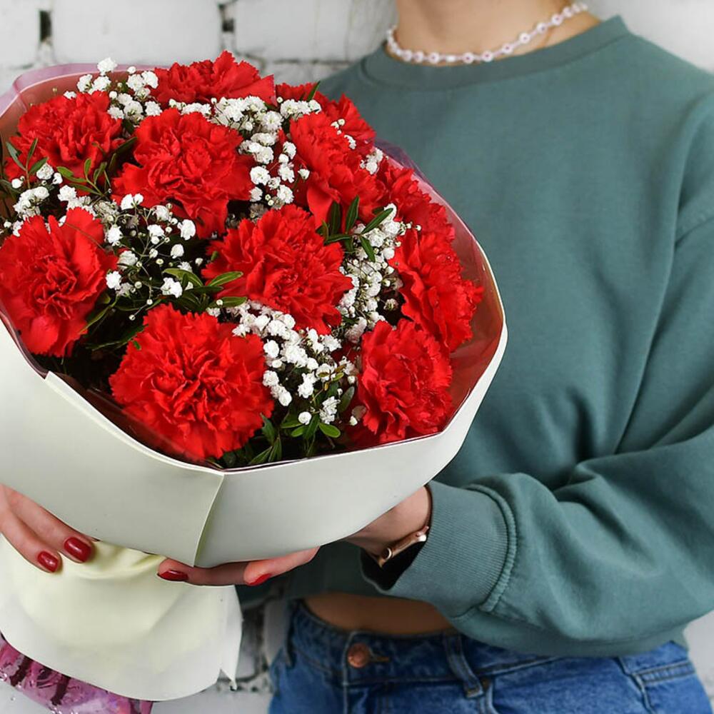 Букет 11 красных гвоздик с гипсофилой