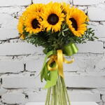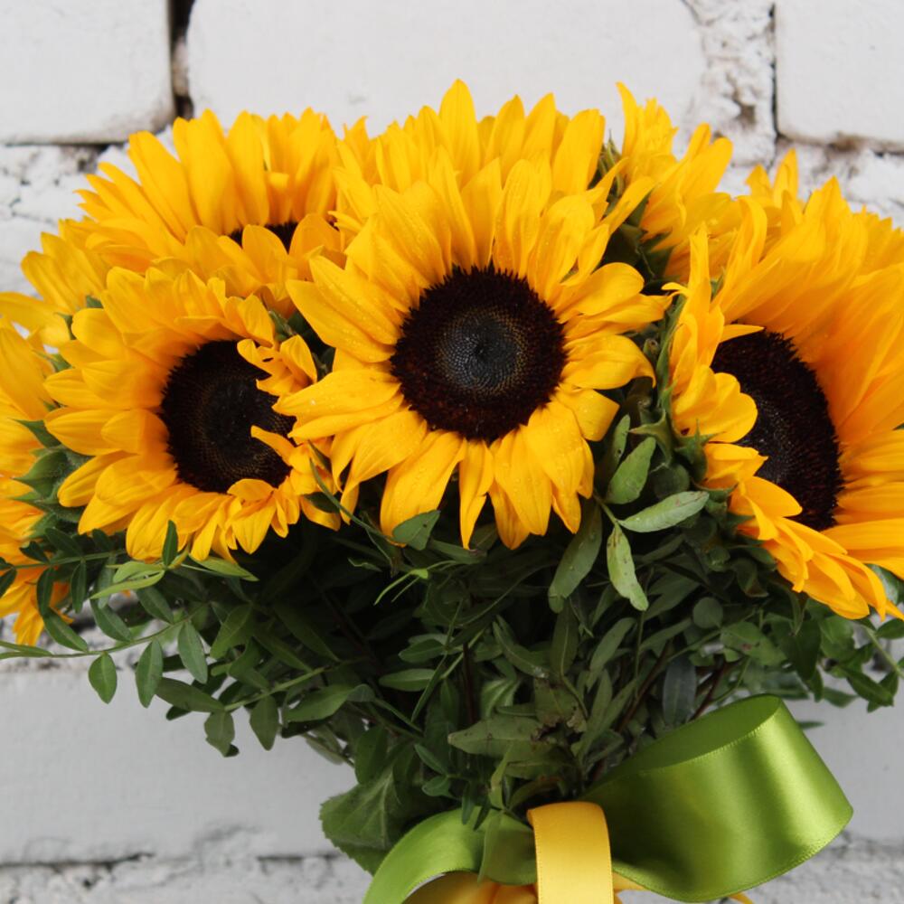 Букет 15 подсолнухов с зеленью