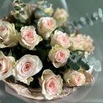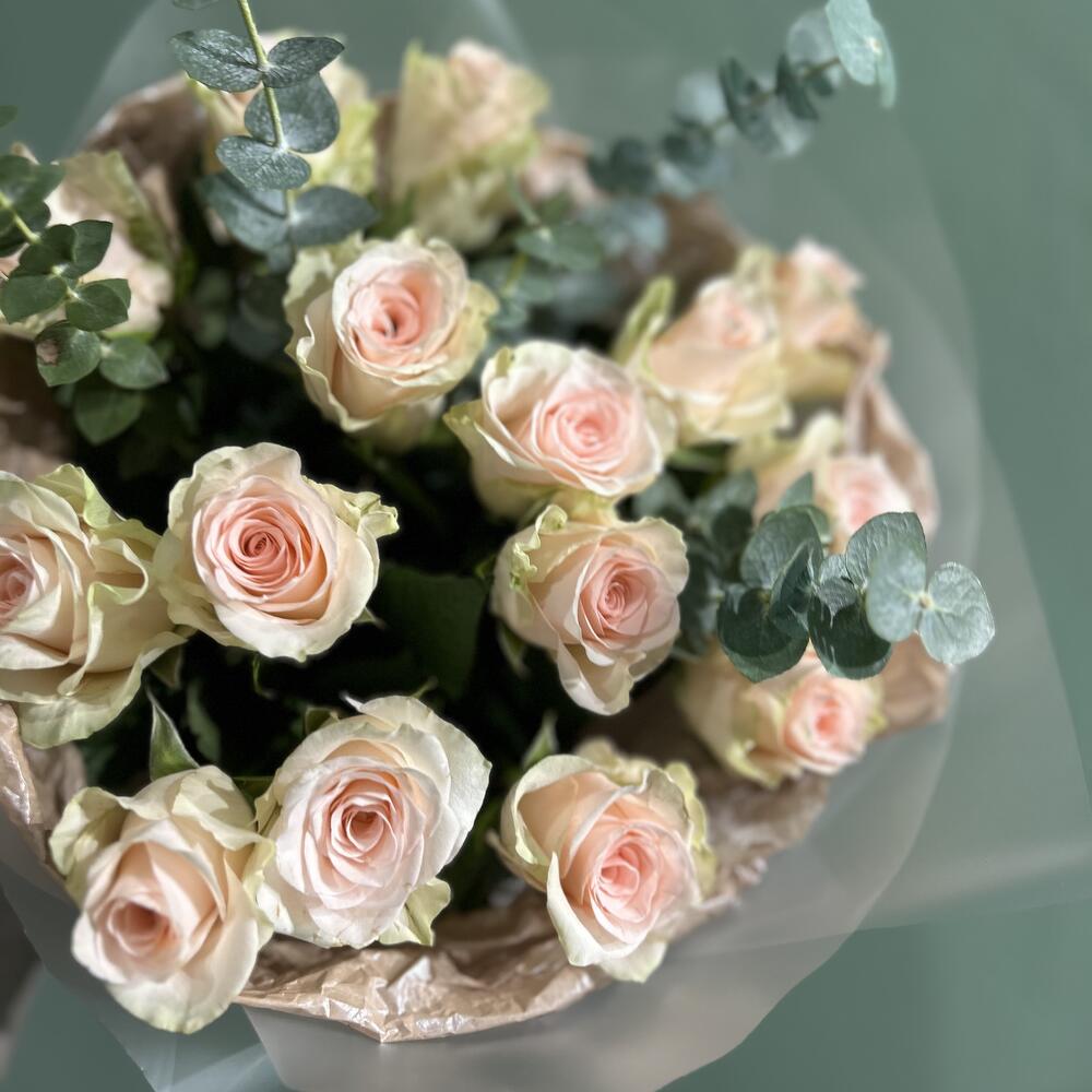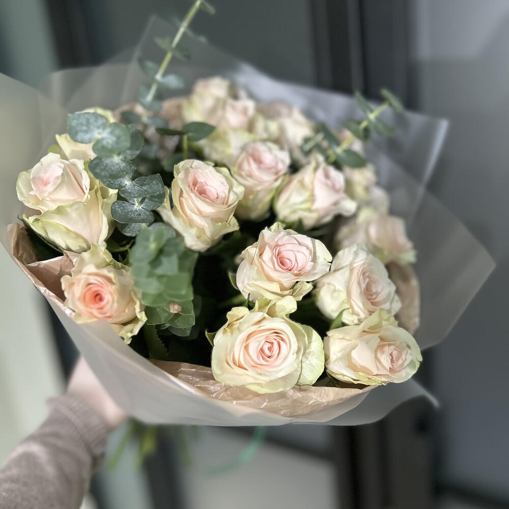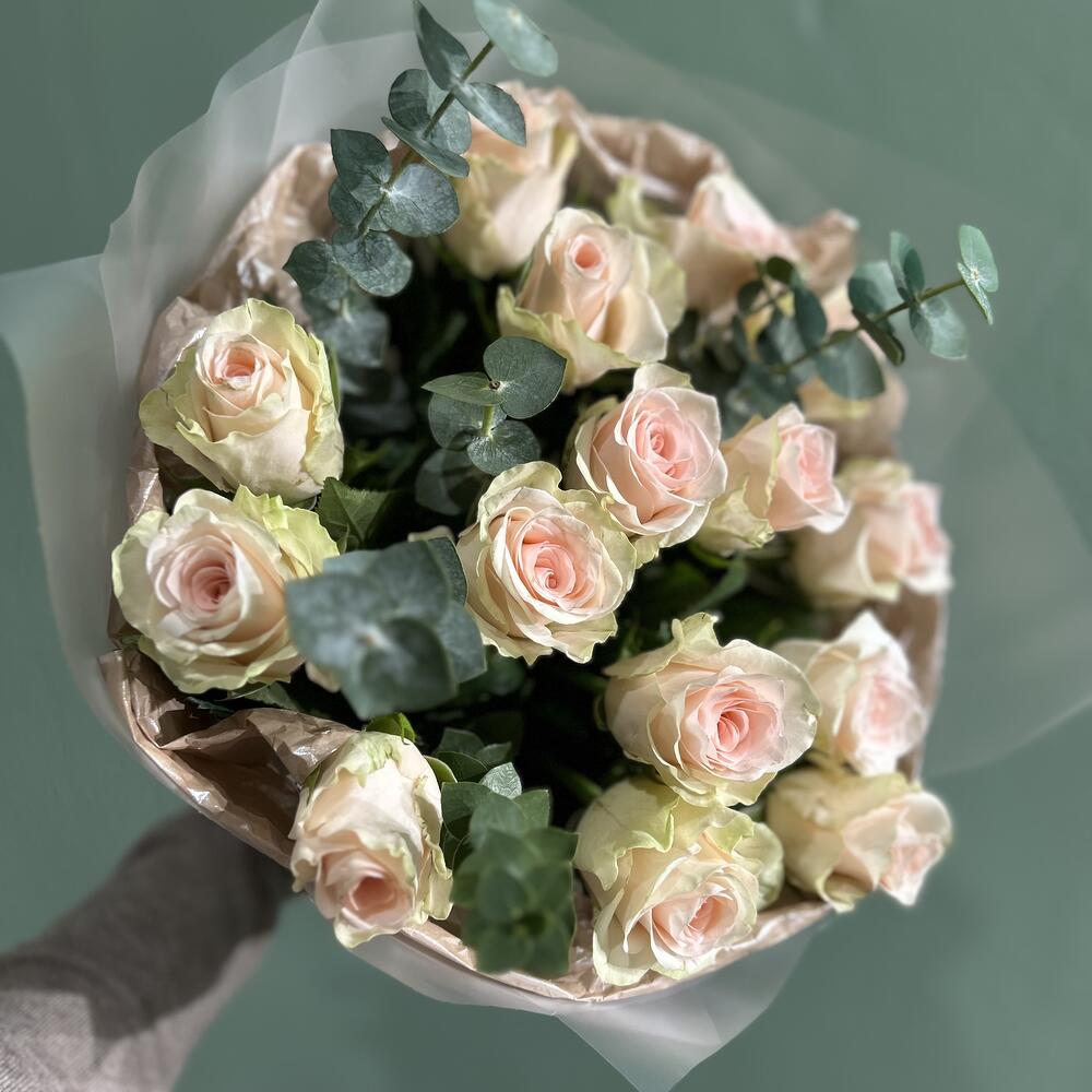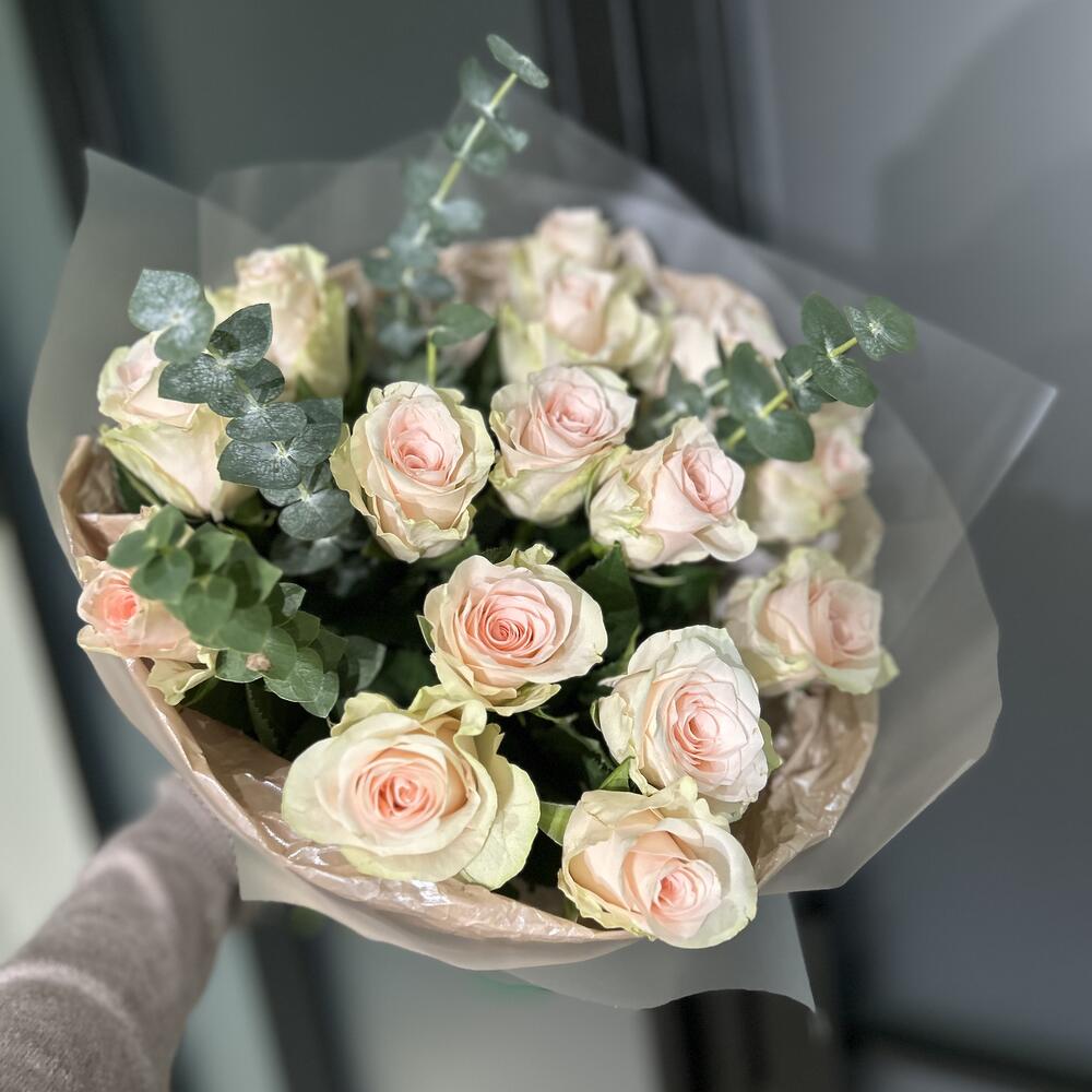 Эвкалипт - 2 шт. Роза 50 см - 15 шт. Упаковка дизайнерская - 1 шт.