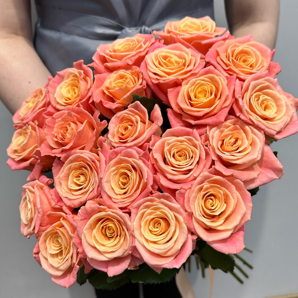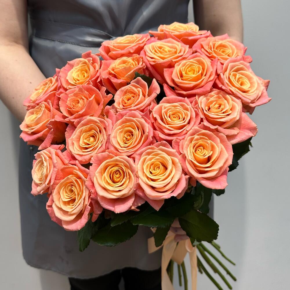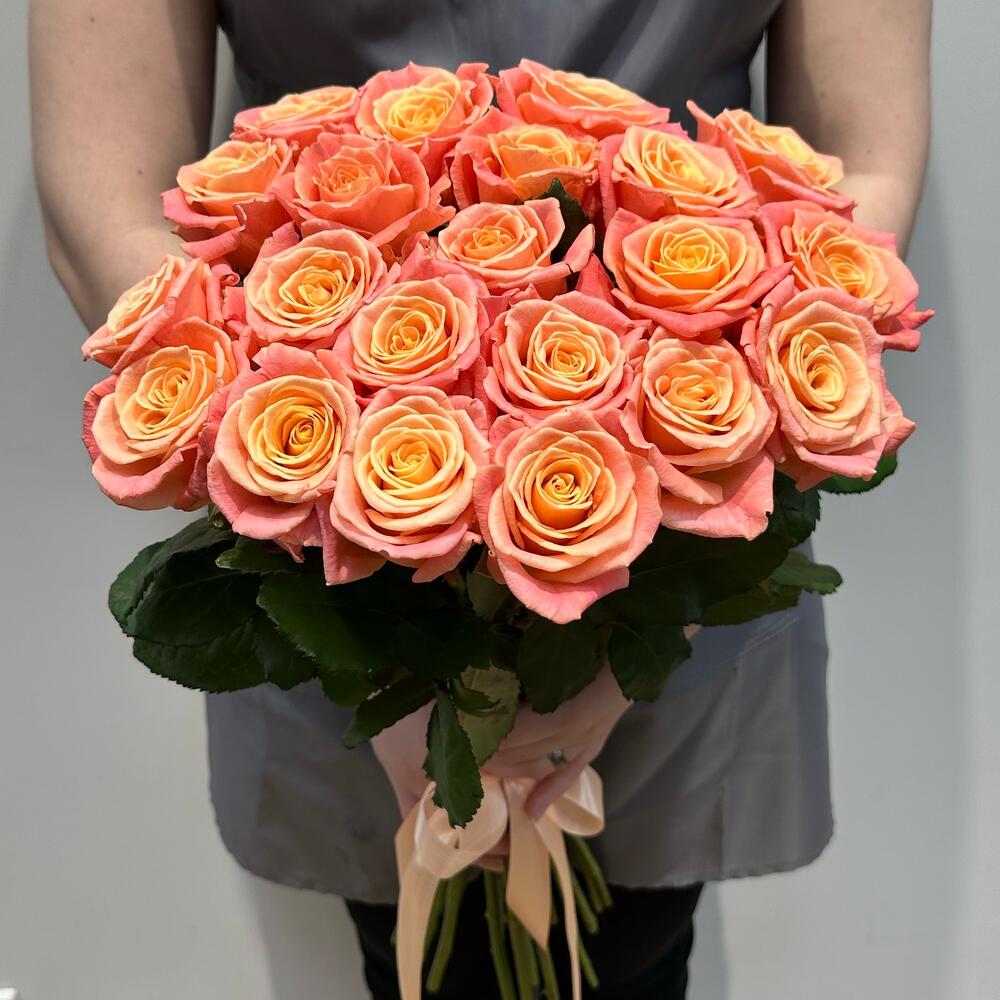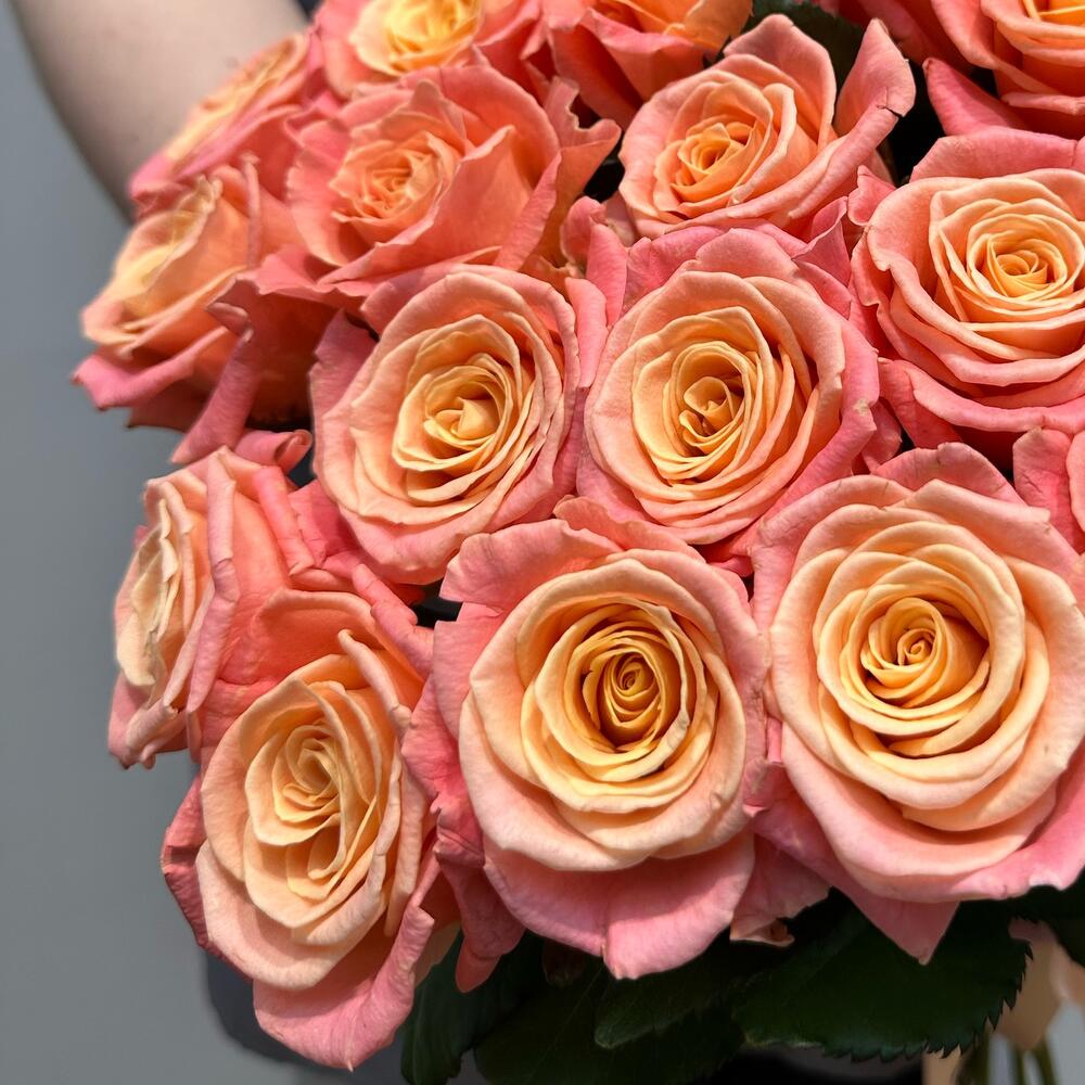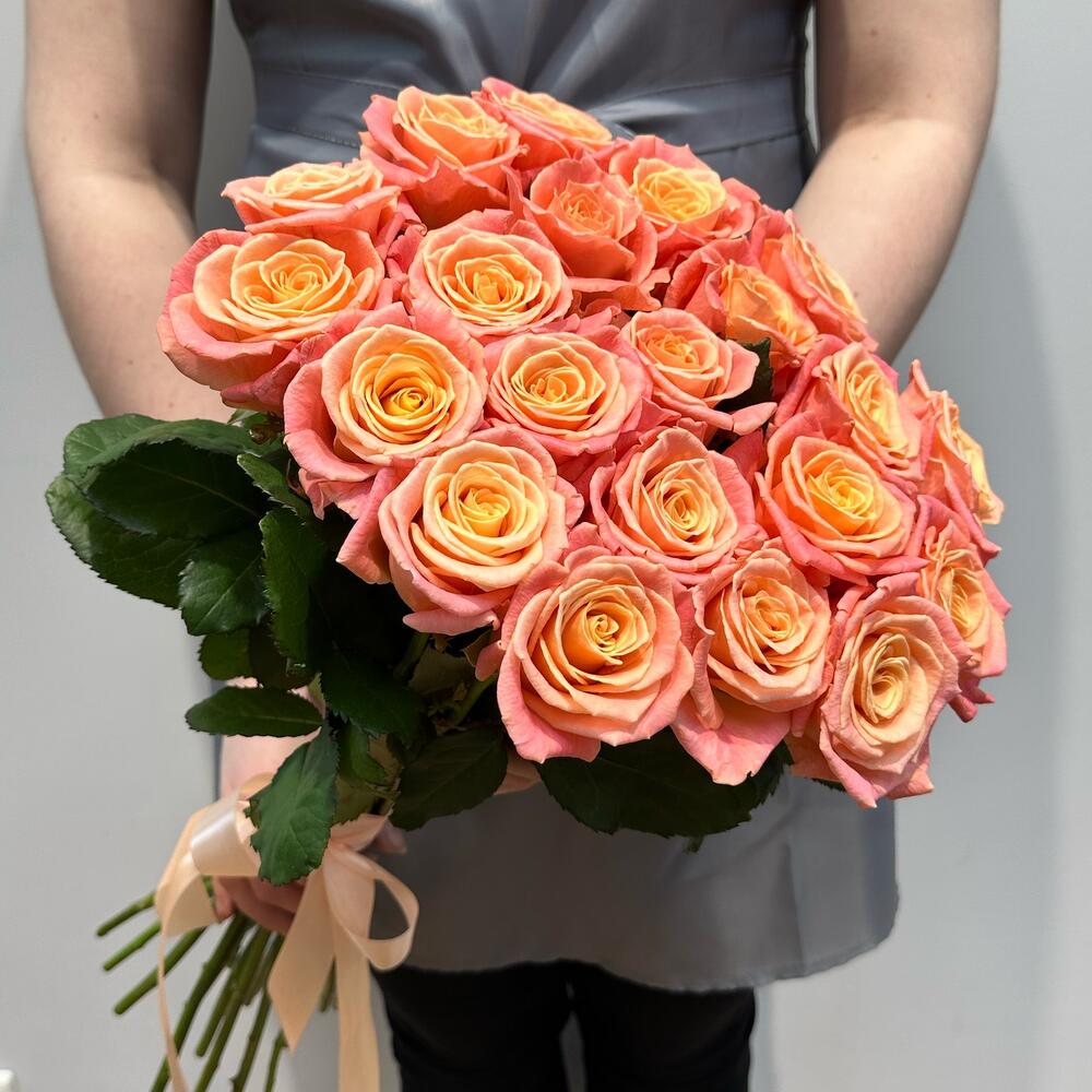 Этот изысканный букет из 19 персиковой розы притягивает взгляд своей элегантностью и нежностью.