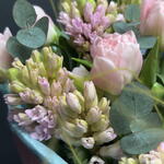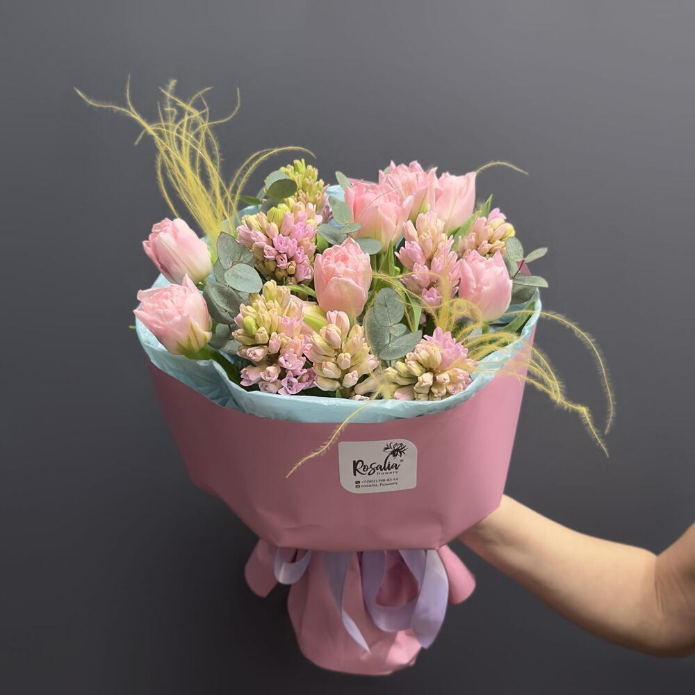 Гиацинт - 8 шт. Эвкалипт - 1 шт. Ковыль - 2 шт. Тюльпан премиум - 7 шт. упаковка тишью 1 лист - 3 шт. открытка фирменная - 1 шт. упаковка пленка матовая 1 м - 2 шт. аква пакет прозрачный - 1 шт. коробка для цветов №s 1 - 1 шт.