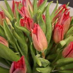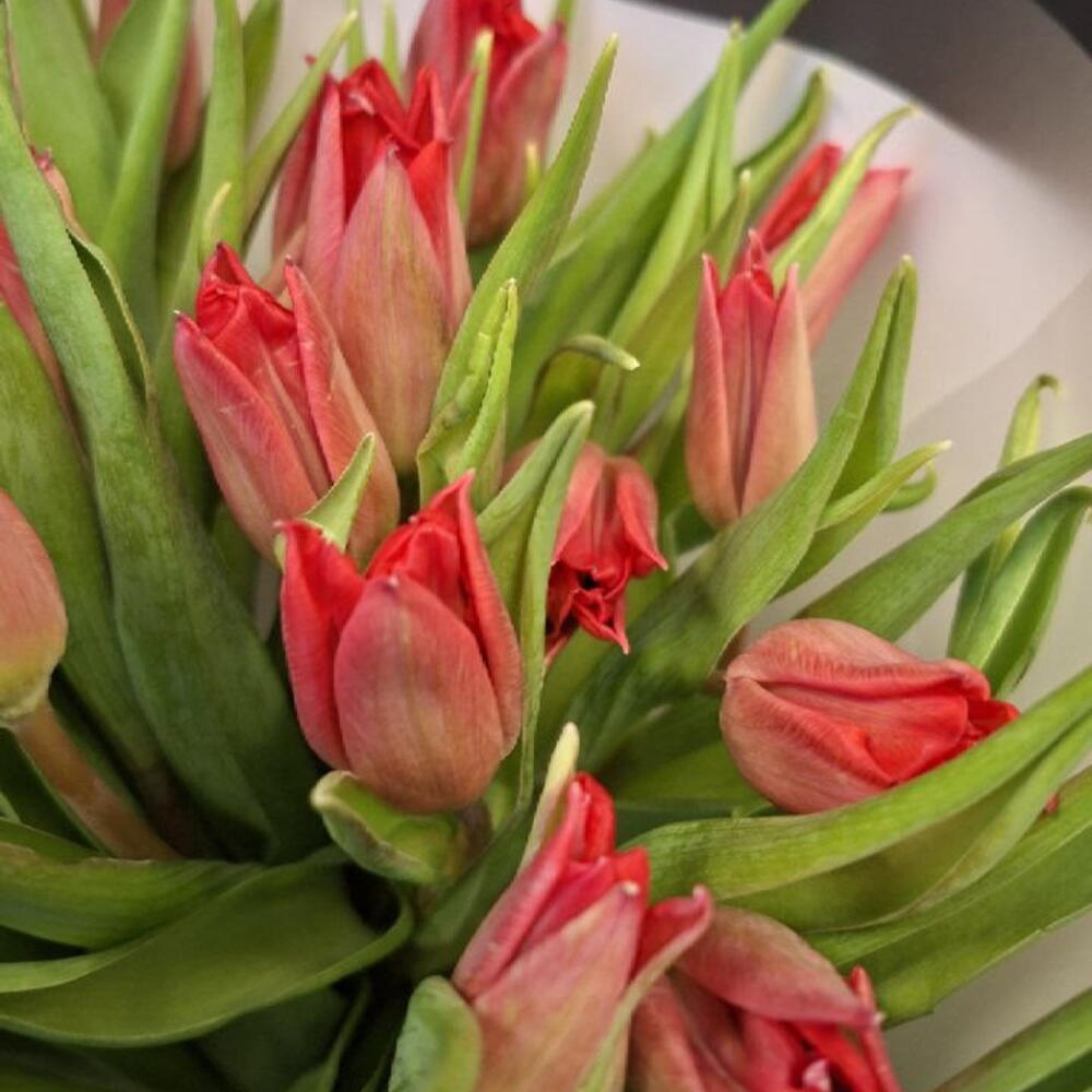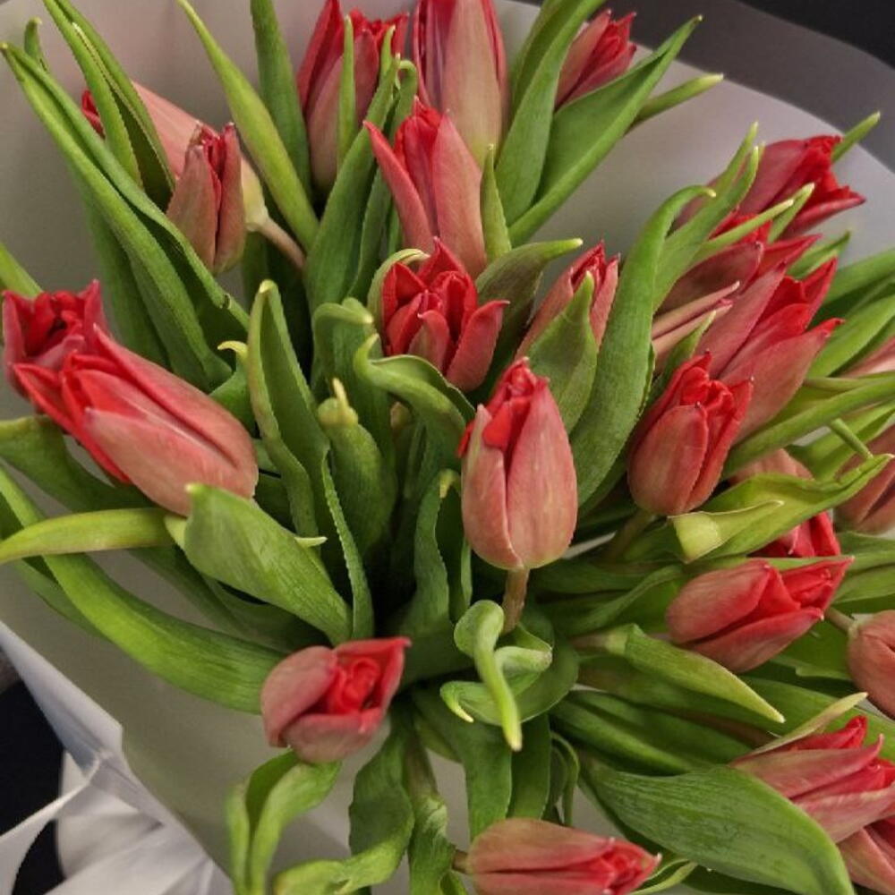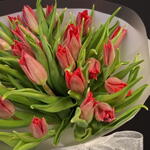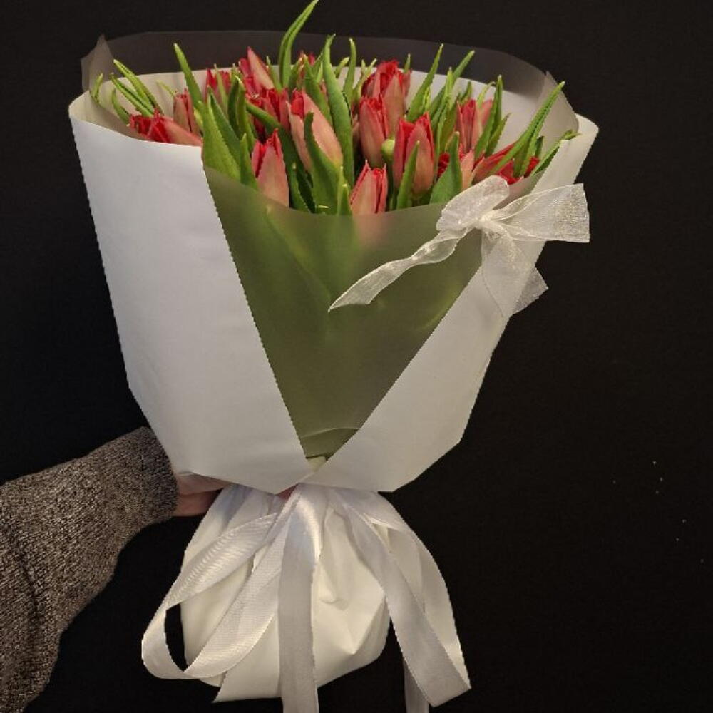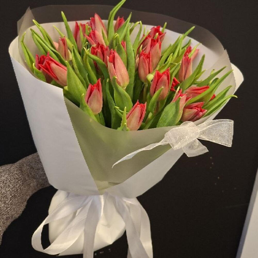 Лента атласная - 1 шт. Упаковка дизайнерская - 1 шт. тюльпаны красные - 25 шт.