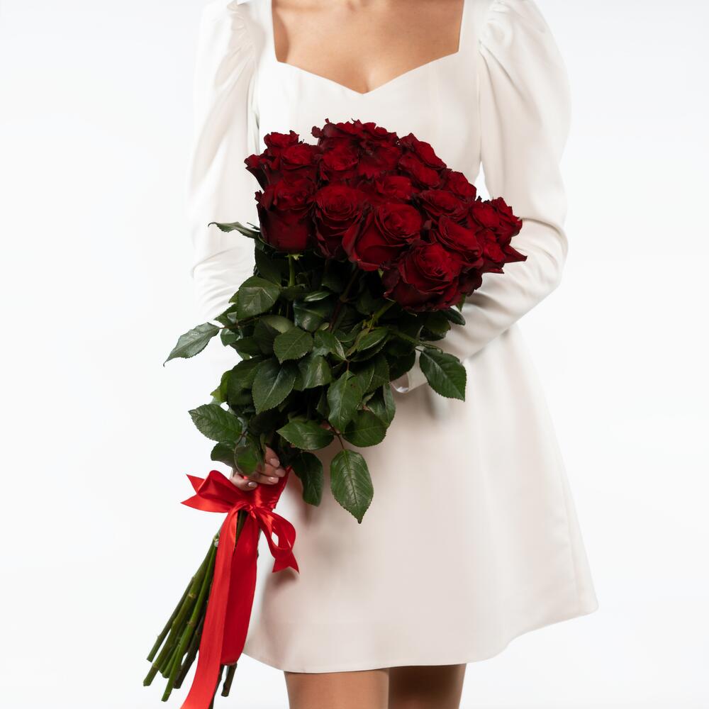 Валентина - прекрасный монобукет из алых роз под ленту на 14 февраля и 8 марта