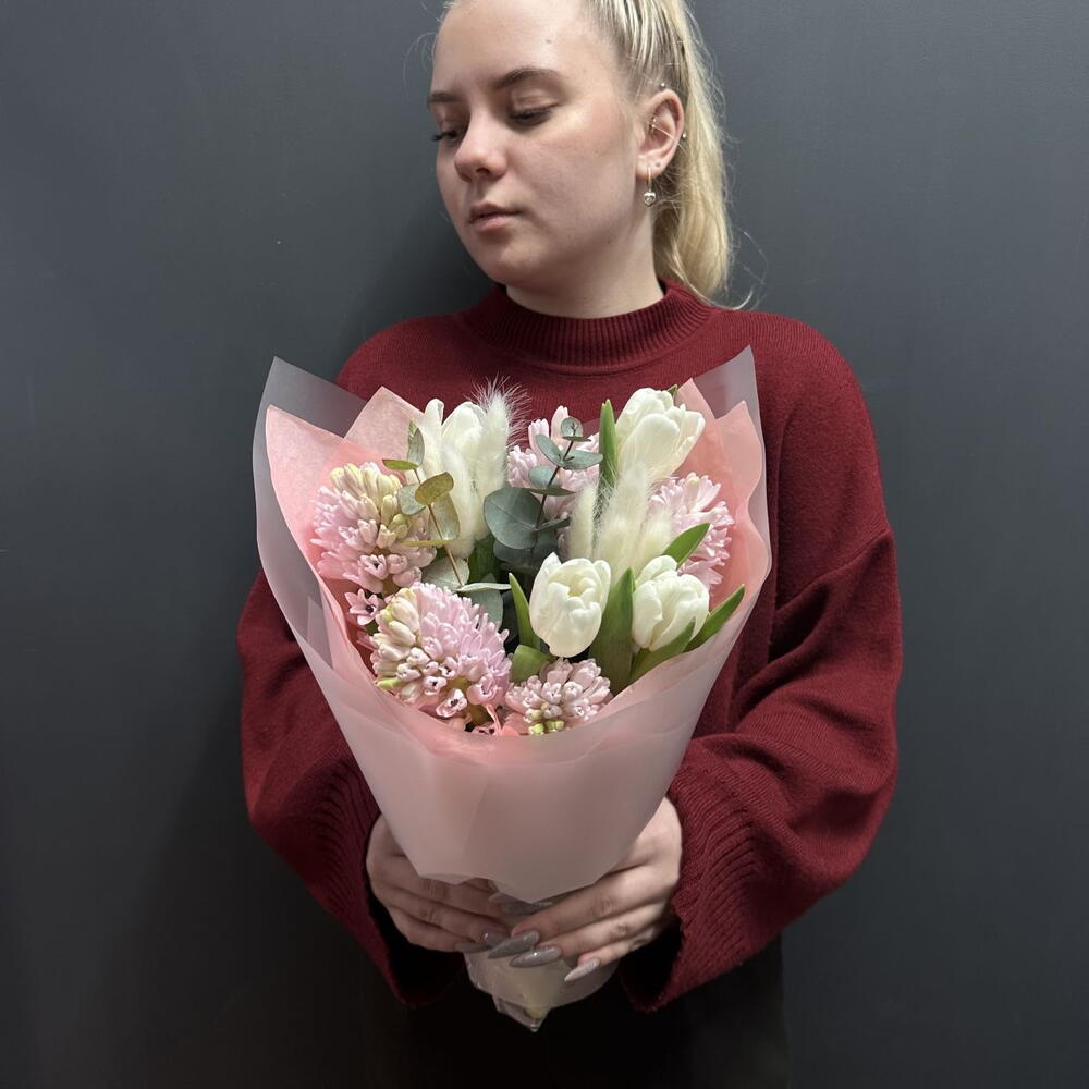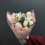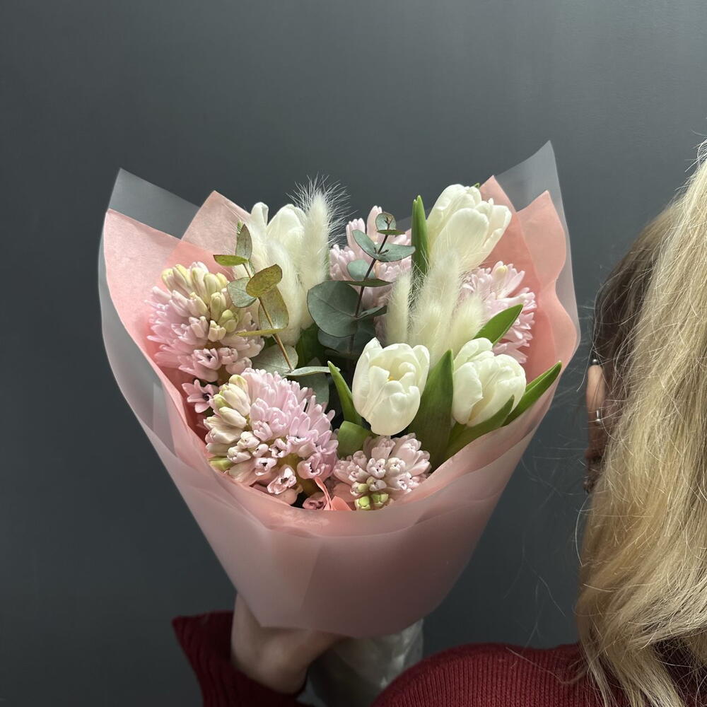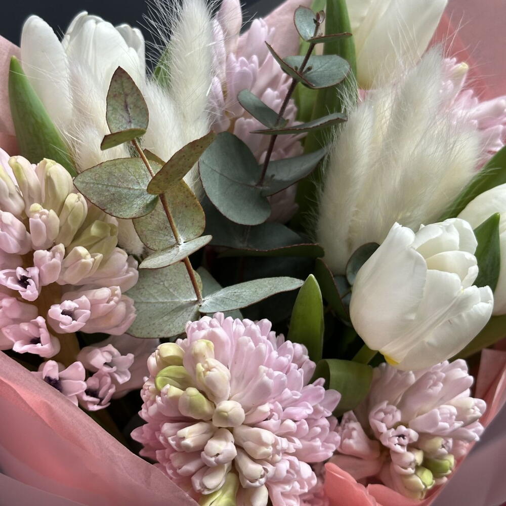 Гиацинт - 5 шт. Эвкалипт - 1 шт. Тюльпан дабл - 4 шт. лагурус италия - 1 шт. упаковка тишью 1 лист - 1 шт. открытка фирменная - 1 шт. упаковка пленка матовая 1 м - 2 шт. аква пакет прозрачный - 1 шт. коробка для цветов №s 1 - 1 шт.
