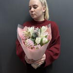 Букет из тюльпанов и гиацинтов Доставляется в транспортировочной коробке Состав: гиацинт, тюльпаны, лагурус, упаковка пленка матовая, эвкалипт Ширина, см: 30 Длина, см: 30 Высота, см: 40 Вес: 0.9 кг..