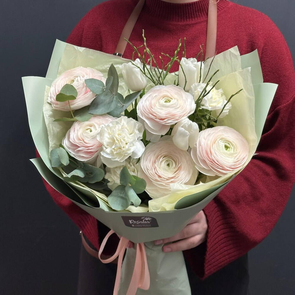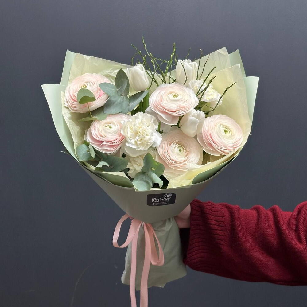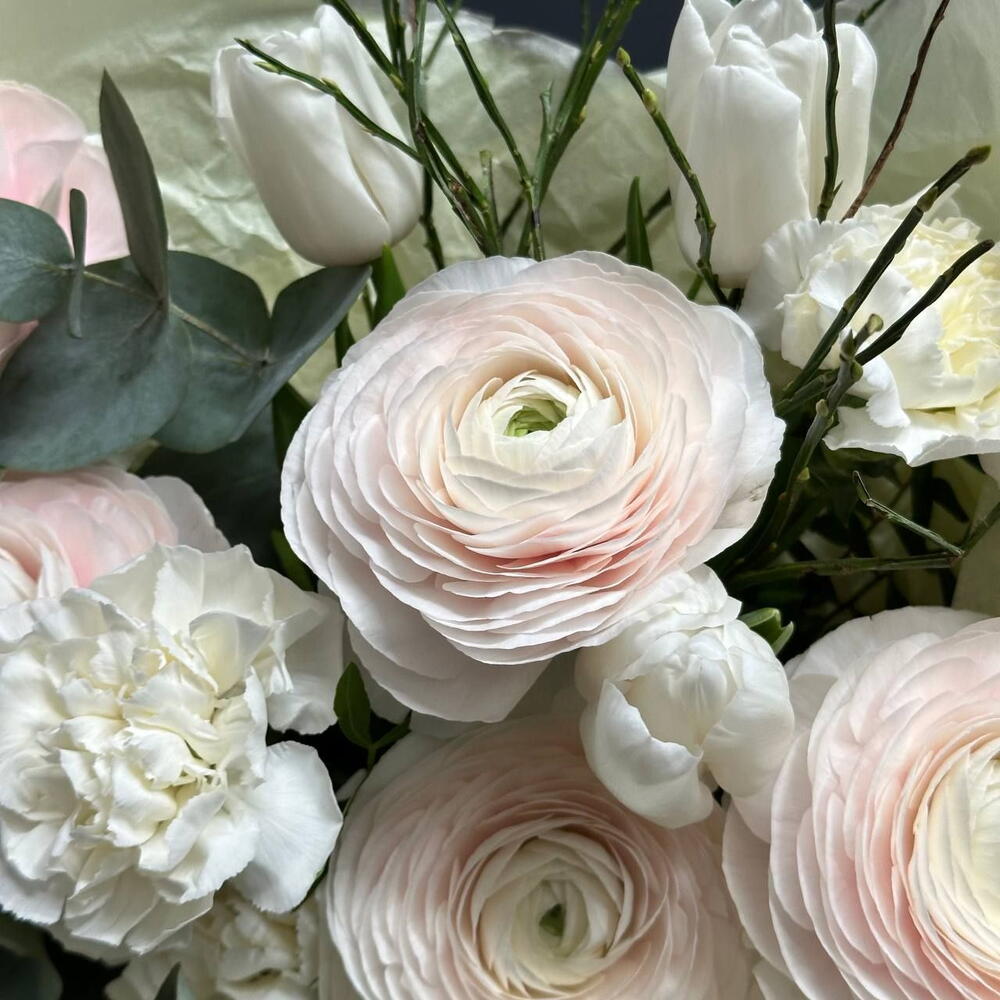 Эвкалипт - 1 шт. Фисташка - 2 шт. Ранункулюс - 5 шт. Тюльпан дабл - 3 шт. Вациниум - 1 шт. гвоздика сорт - 3 шт. упаковка тишью 1 лист - 2 шт. открытка фирменная - 1 шт. упаковка пленка матовая 1 м - 2 шт. аква пакет прозрачный - 1 шт. коробка для цветов №s 1 - 1 шт.