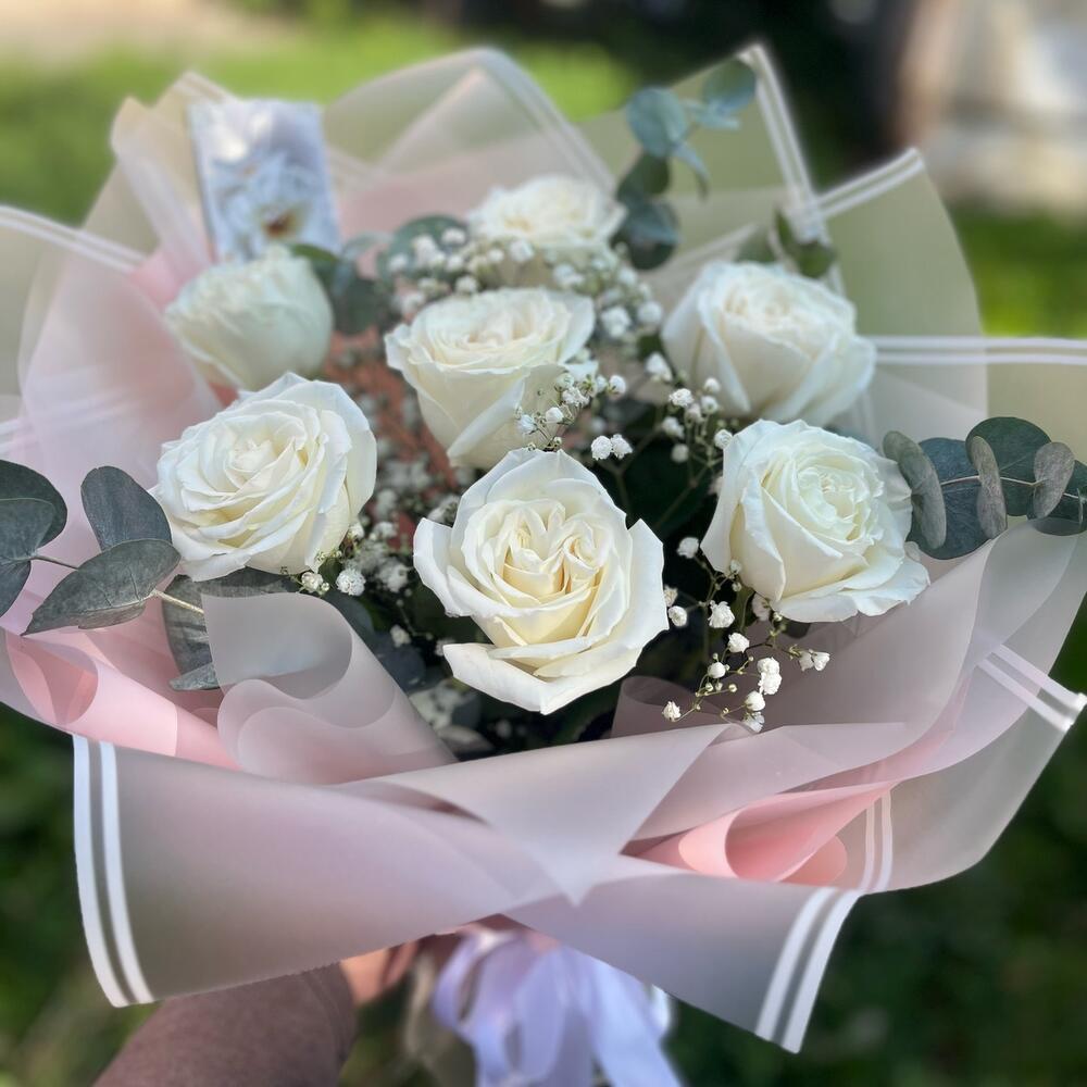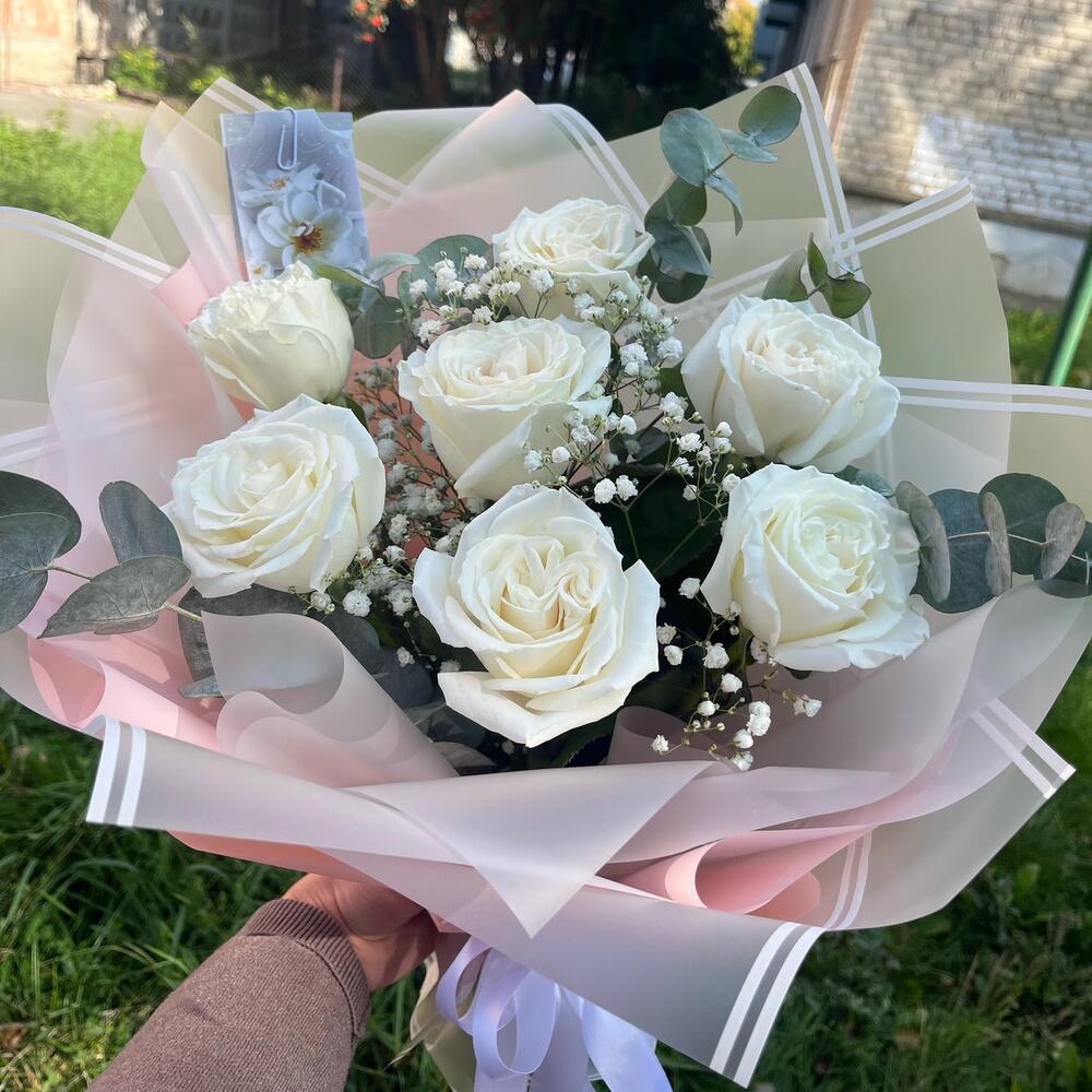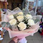Гипсофила - 1 шт. Роза Эквадор - 7 шт. Упаковка - 1 шт. Лента атласная - 1 шт. эвкалиптгип - 5 шт.
