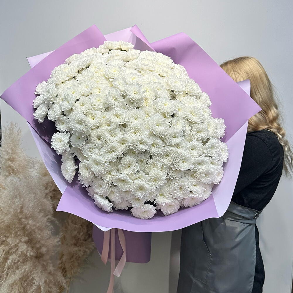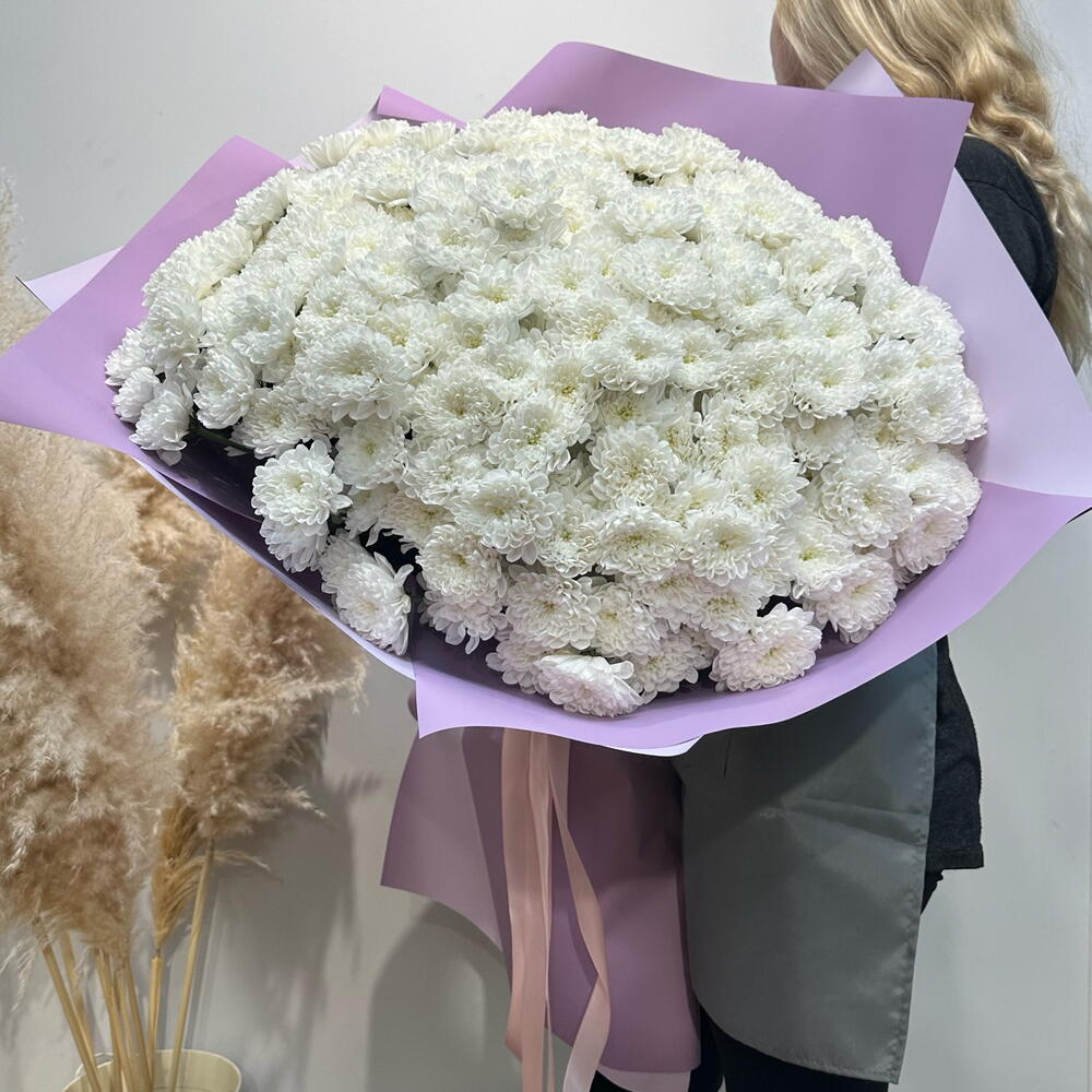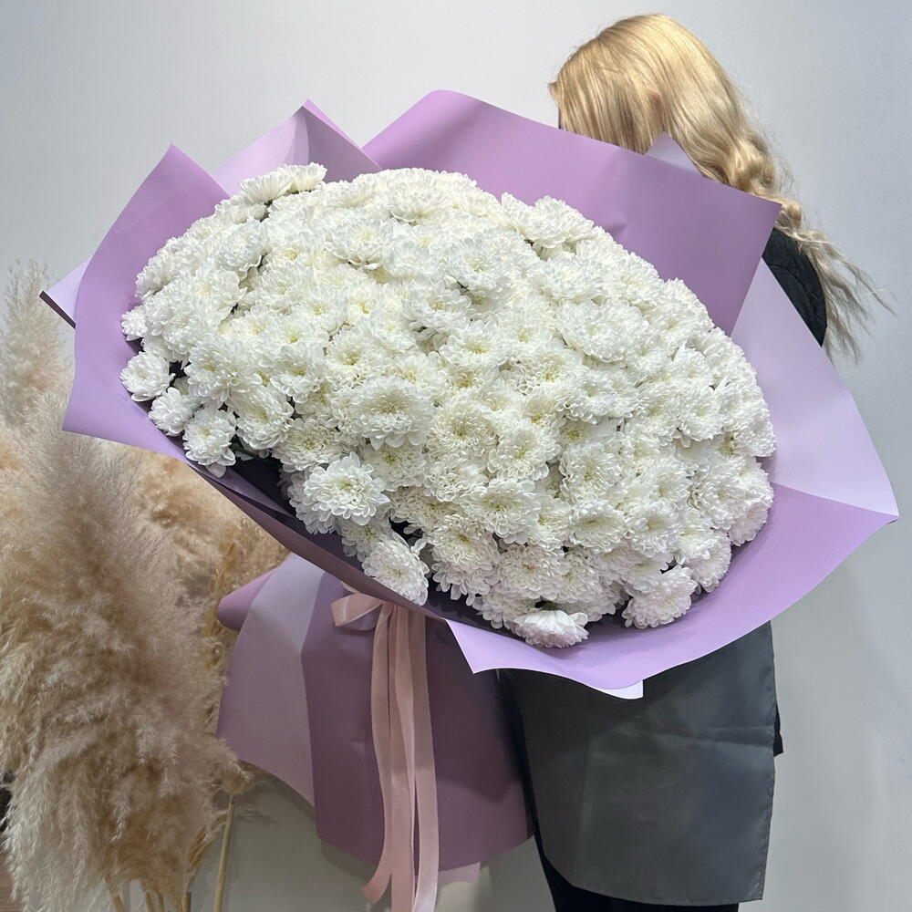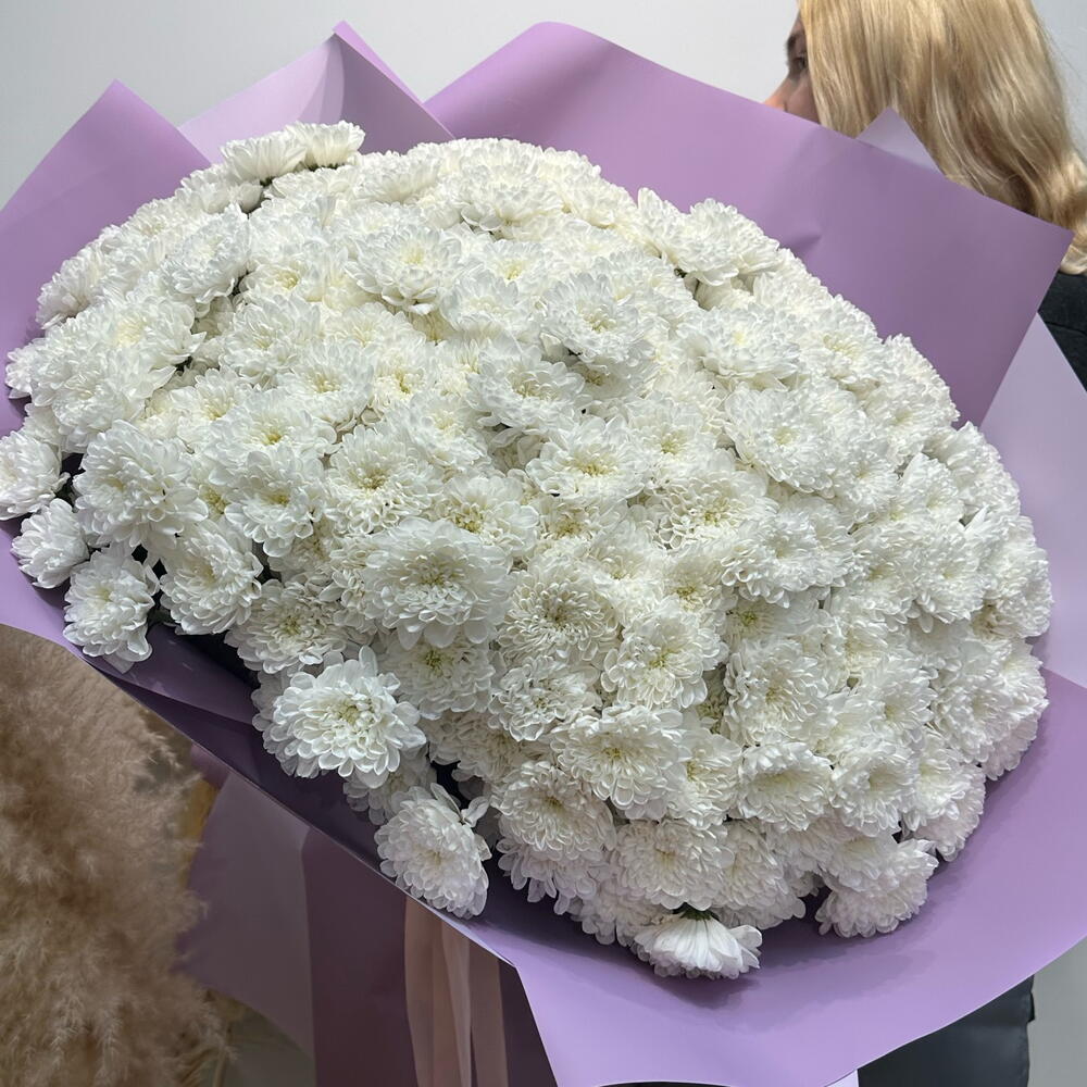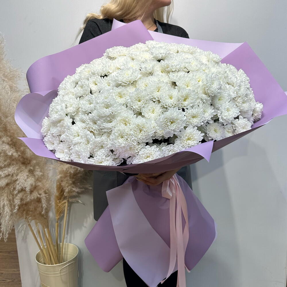 Лента атласная - 1 шт. Упаковка дизайнерская - 1 шт. Хризантема кустовая Алтай - 51 шт.