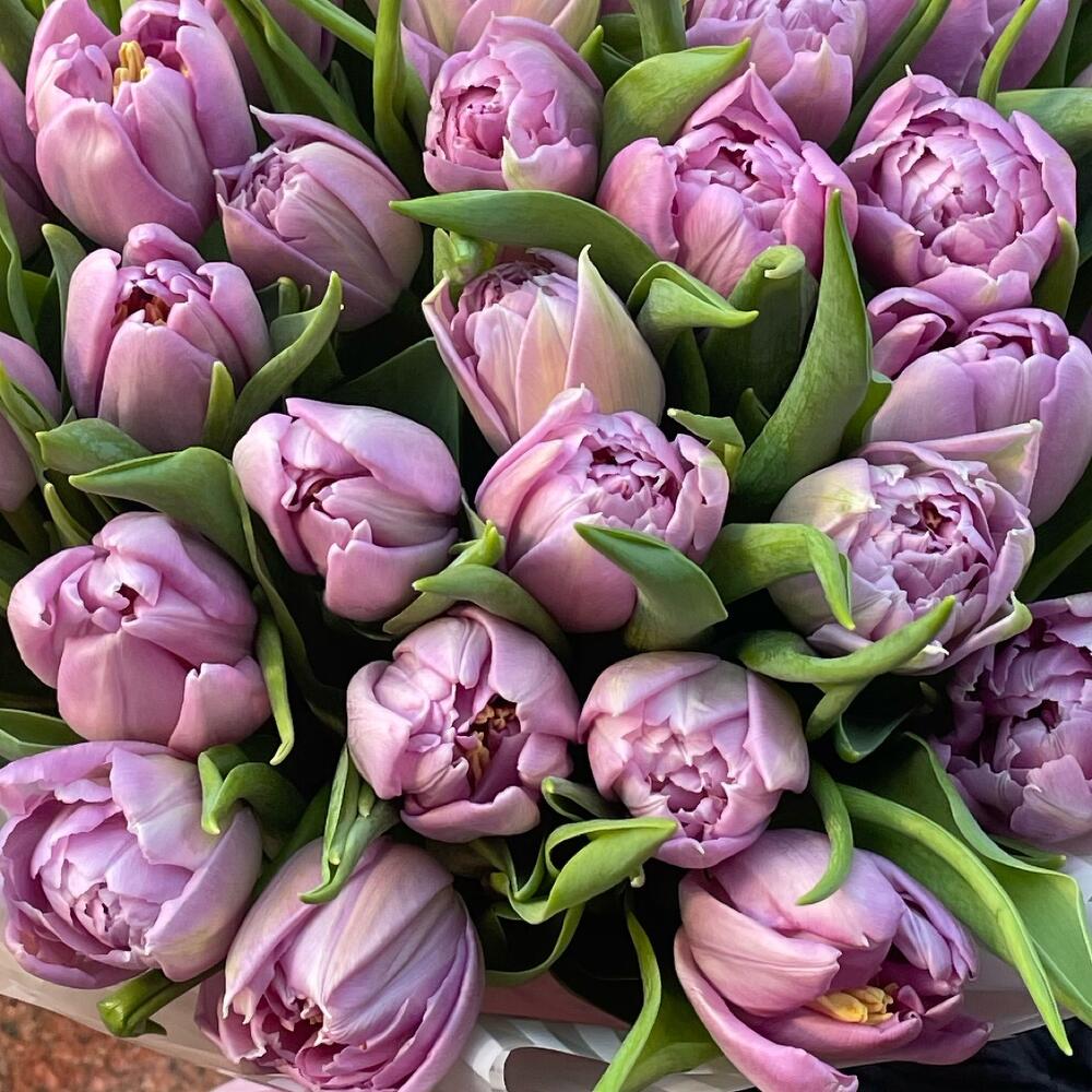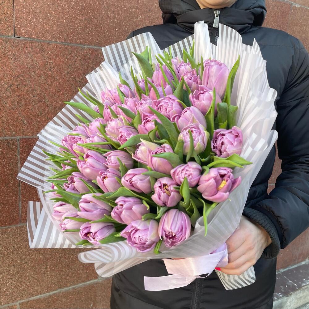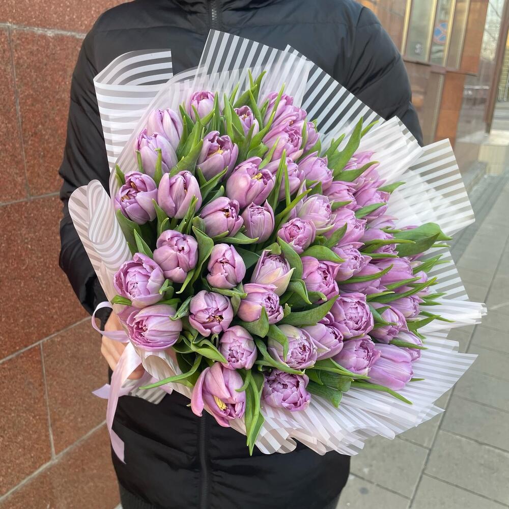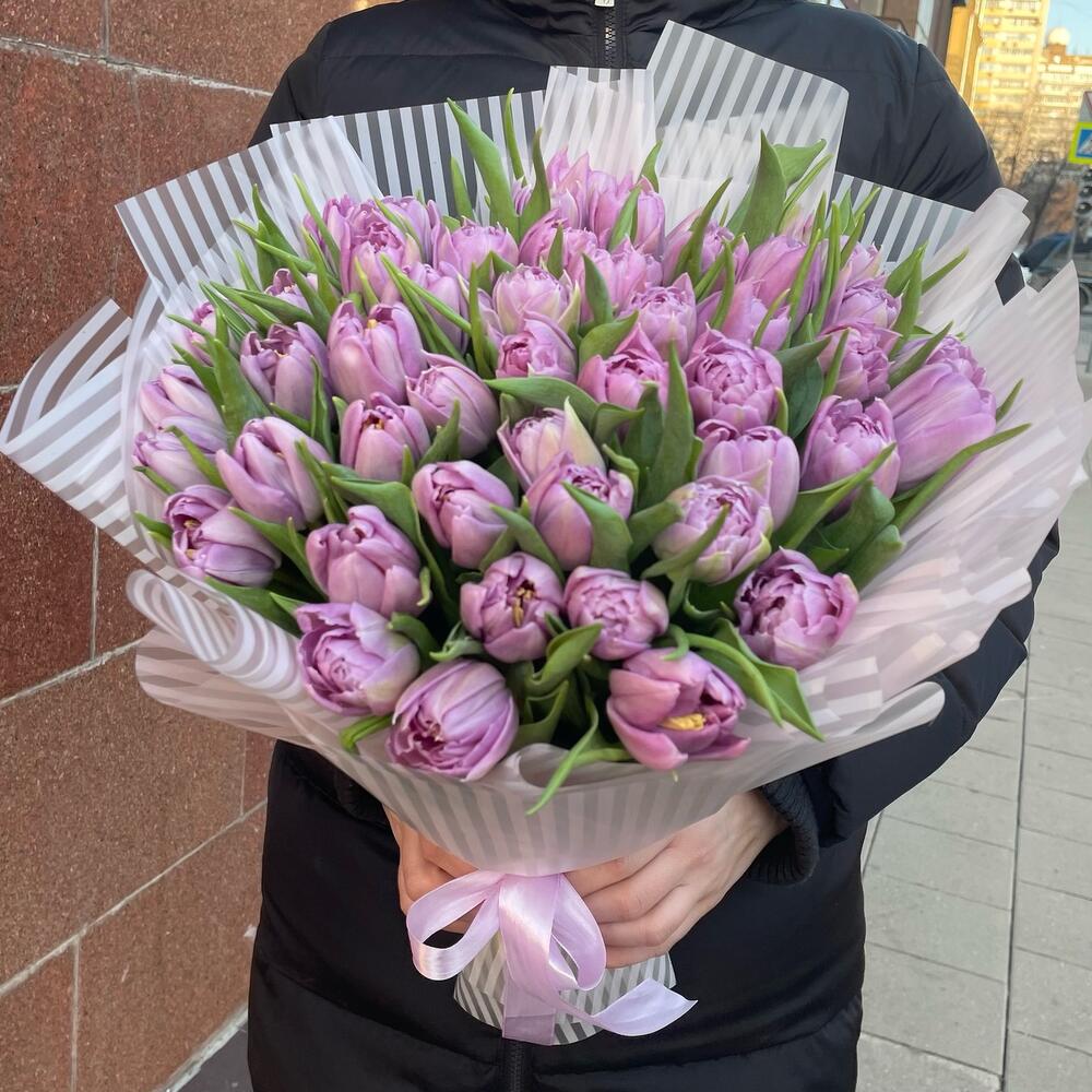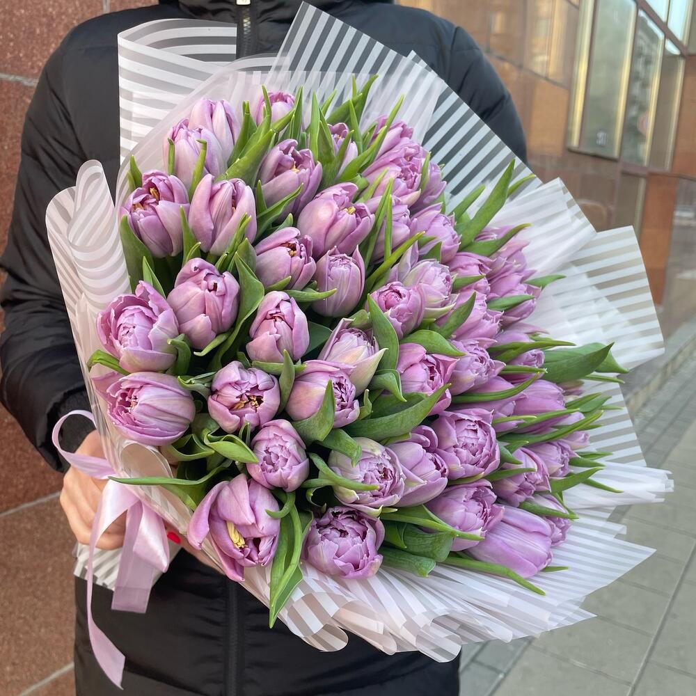 Лента атласная - 1 шт. Тюльпан Пионовидный - 49 шт. Пленка матовая - 1 шт.