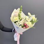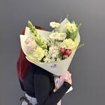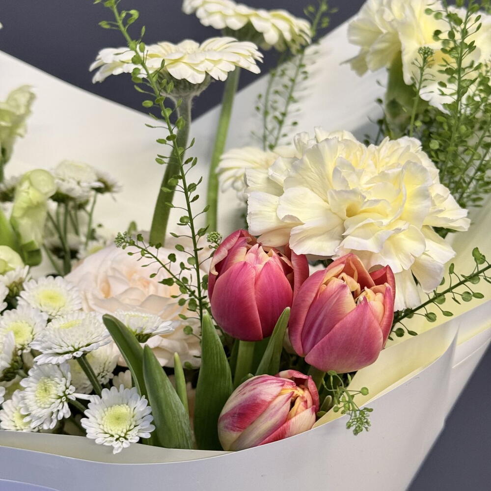 Гербера мини - 3 шт. Фисташка - 3 шт. Тюльпан дабл - 3 шт. Хризантема кустовая mix - 2 шт. гвоздика сорт - 3 шт. открытка фирменная - 1 шт. пионовидная 70 см - 2 шт. антирринум микс - 2 шт. грин дракон - 1 шт. упаковка пленка матовая 1 м - 2 шт. аква пакет прозрачный - 1 шт. коробка для цветов №s 1 - 1 шт.