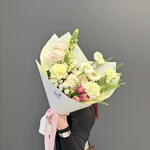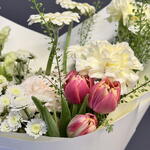 Букет с весенним настроением. В составе яркие тюльпаны, нежные герберы и розы, а также антир и грин дракон, которые придают интересную форму букету Доставляется в транспортировочной коробке Состав: роза кустовая пионовидная, хризантема, гербера мини, фисташка, гвоздика, антир, упаковка пленка матовая, тюльпаны, гринбел Ширина, см: 27 Длина, см: 27 Высота, см: 50 Вес: 0.9 кг..