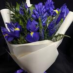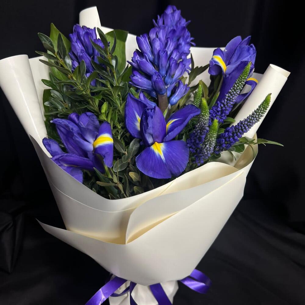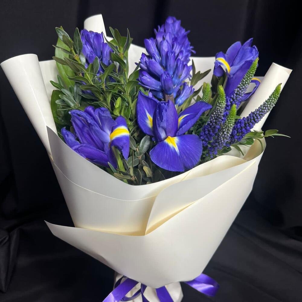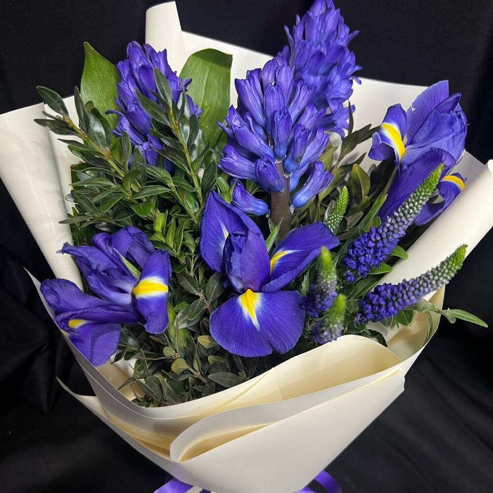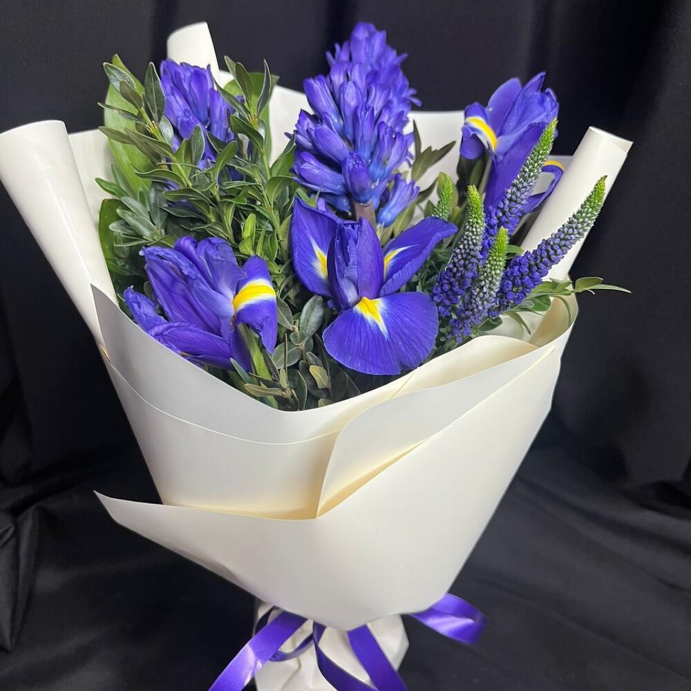 Вероника - 1 шт. Лента - 1 шт. Ирис синий - 3 шт. Гиацинт синий - 3 шт. самшит зелень - 1 шт. пленка матовая белая - 1 шт.