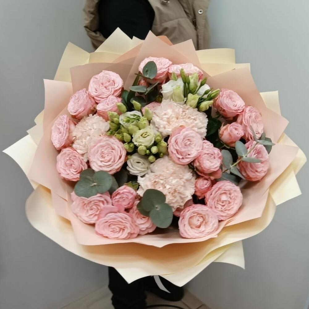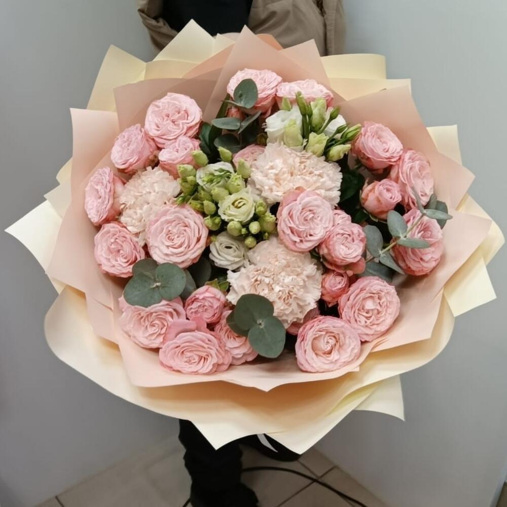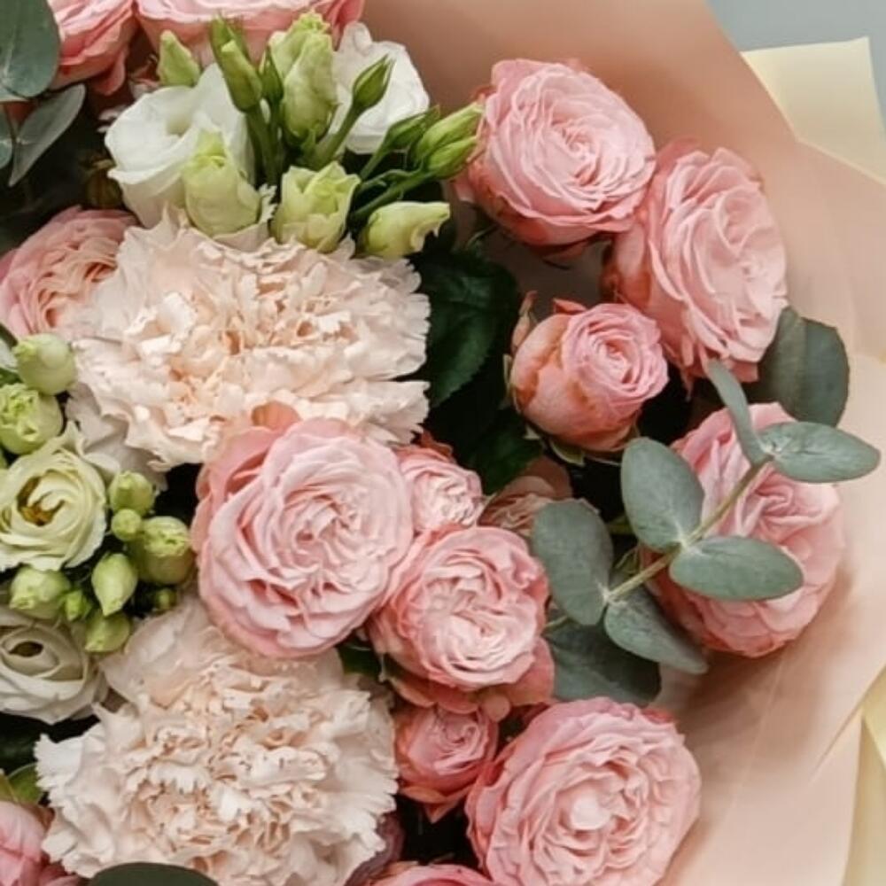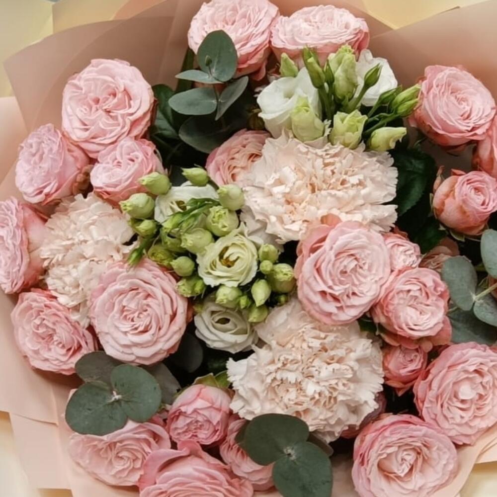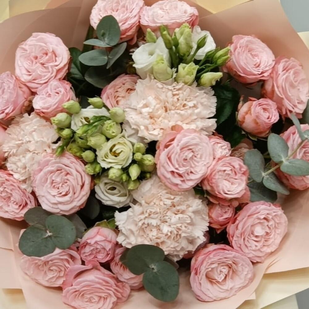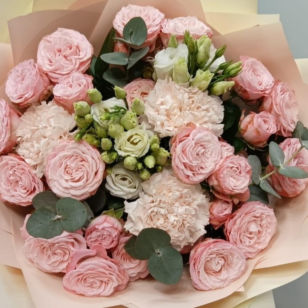 Букет из кустовой пионовидной розы, эвкалипта, эустомы, диантуса