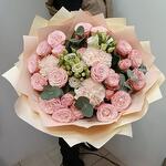 Эвкалипт - 3 шт. Кустовая роза - 8 шт. Упаковка - 5 шт. Эустома - 2 шт. Лента атласная - 2 шт. Диантус - 3 шт.