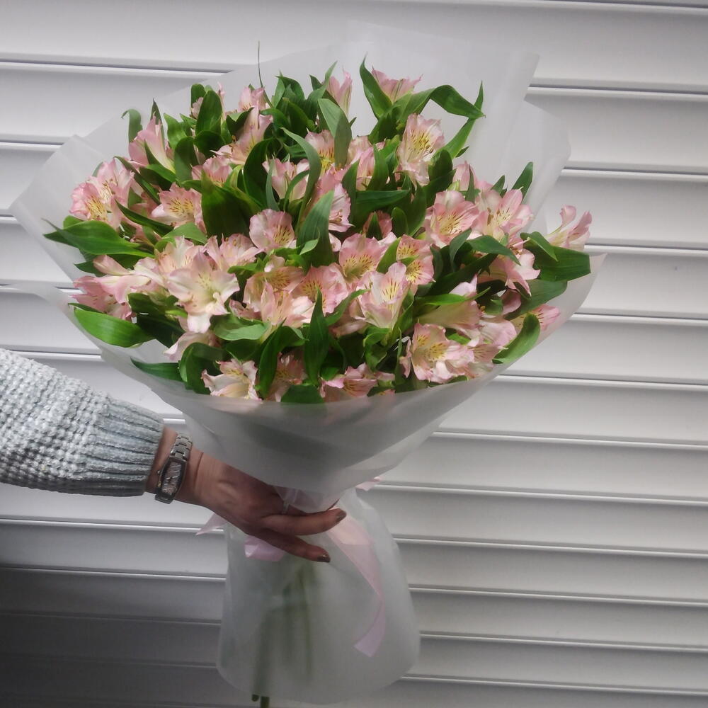 Лента атласная - 1 шт. Упаковка дизайнерская - 1 шт. альстромерия розовая - 11 шт.