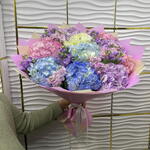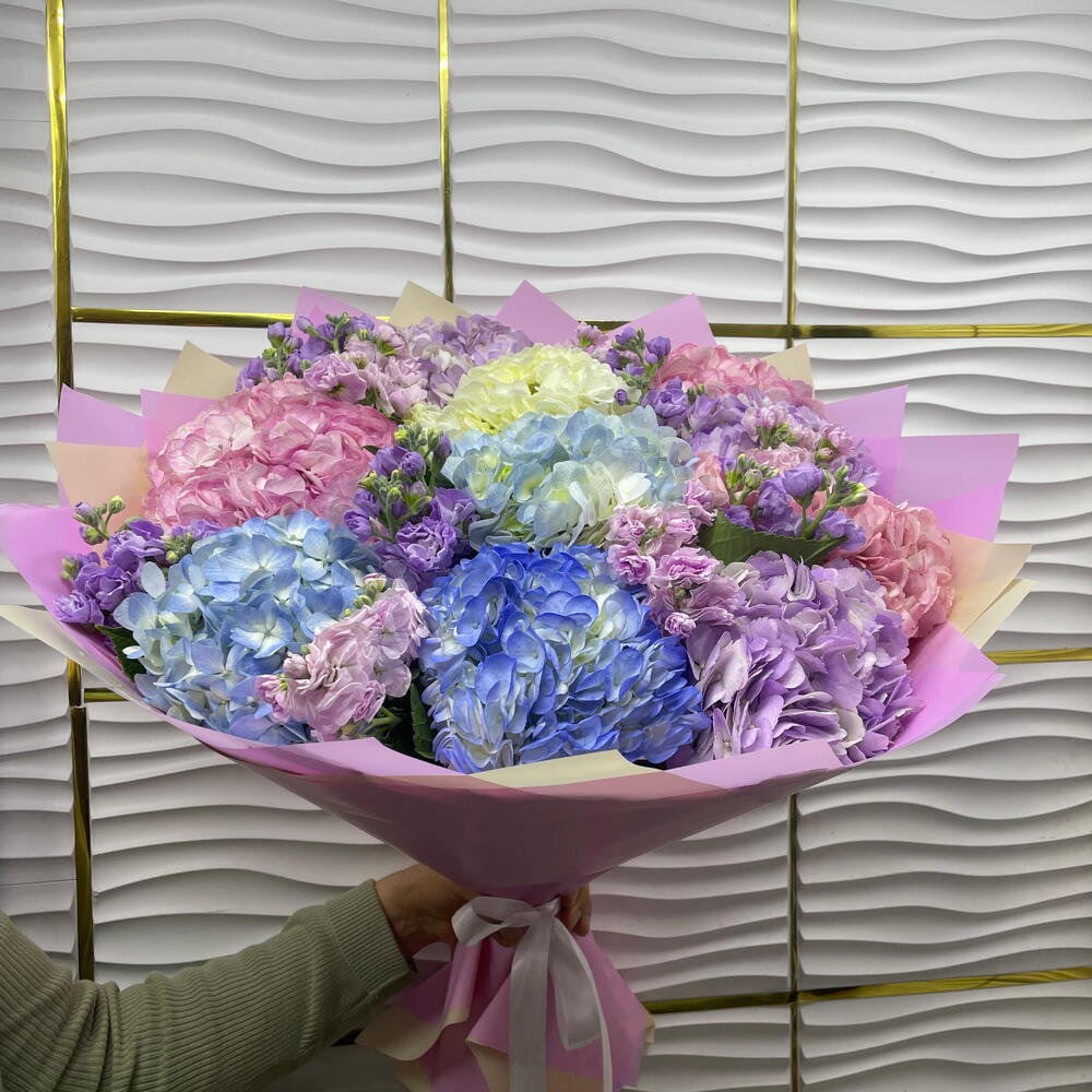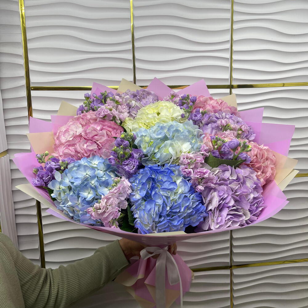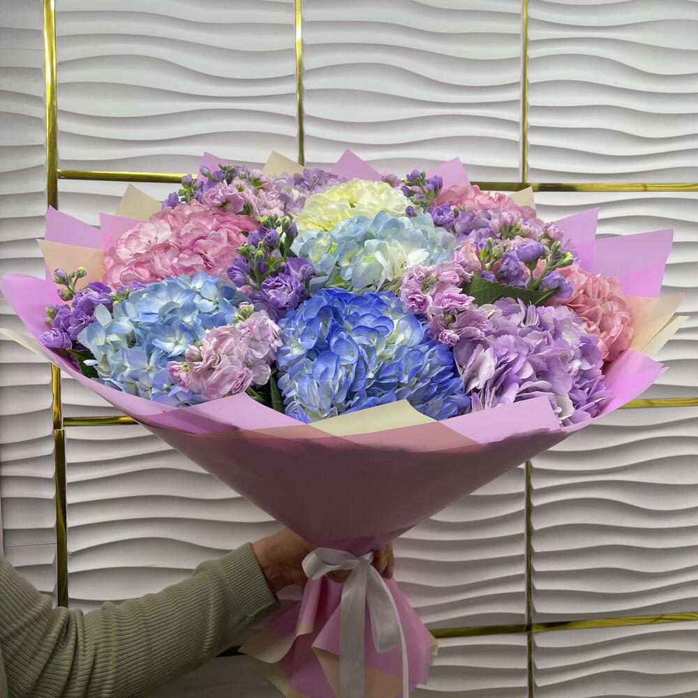 Гортензия - 11 шт. Маттиола - 20 шт. Лента атласная - 1 шт. Упаковка дизайнерская - 9 шт.