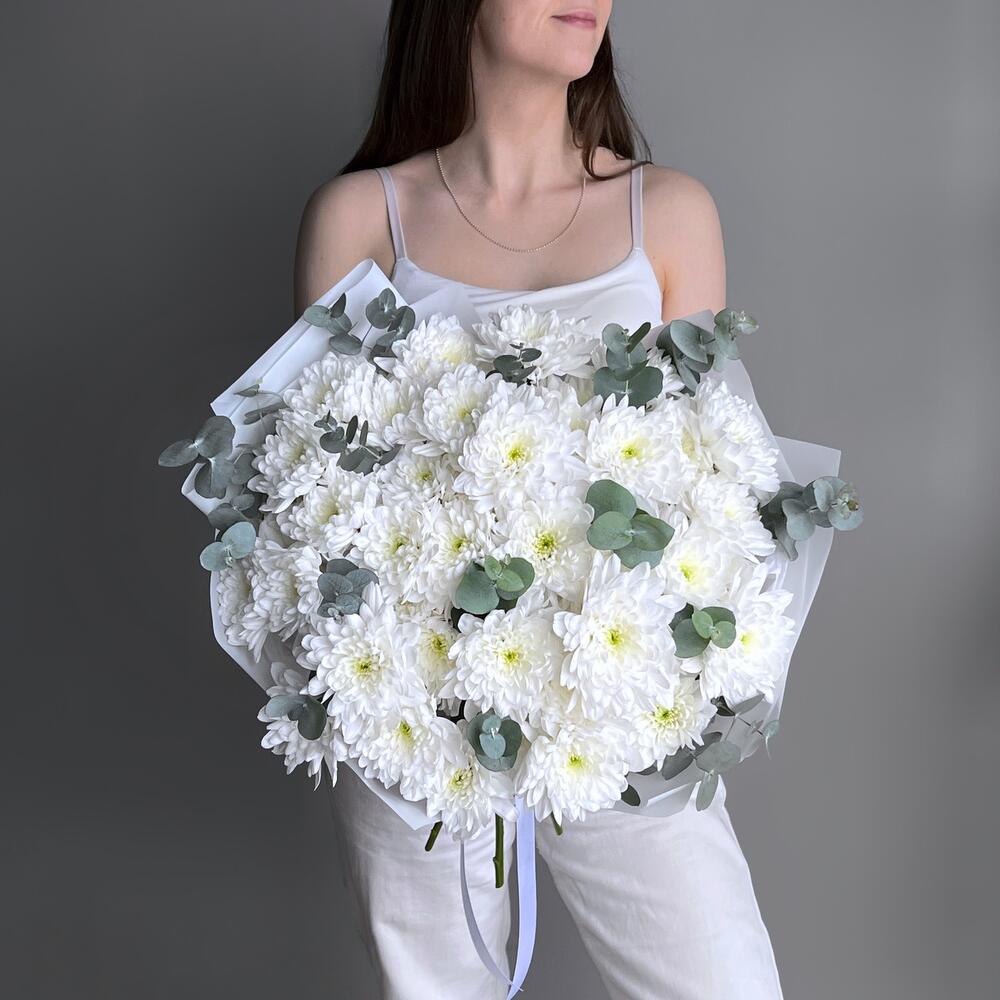 Максимально воздушный букет из белоснежной хризантемы и ароматного эвкалипта. Букет с таким составом очень стойкий и будет долго радовать своей свежестью :) Для вашего удобства все наши букеты доставляются в воде! Не забудьте подрезать цветы НЕПОСРЕДСТВЕННО перед тем как ставить в вазу (после подрезки в течении 2-3 секунд поставьте в воду). Не храните букет на прямых солнечных лучах и возле отопительных приборов, чтобы сохранить цветы свежими как можно дольше. Обратите внимание на размеры букета и фото в полный рост с человеком, для понимания размера композиции, это фото есть в карточке товара :)