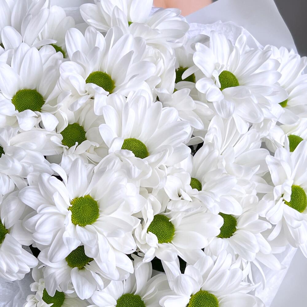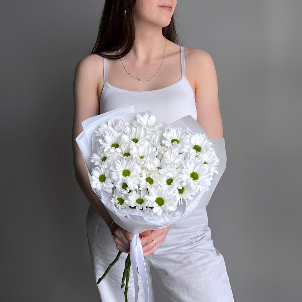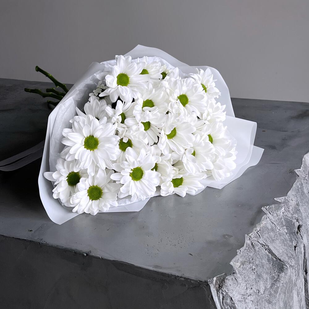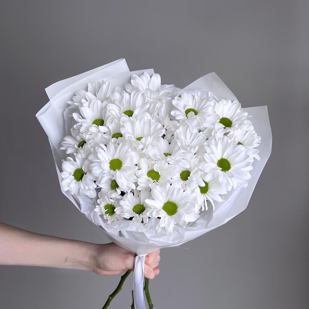 Моно букет из белой кустовой хризантемы ромашкового вида. Букет из таких цветов очень стойкий и будет долго радовать своей свежестью :) Для вашего удобства все наши букеты доставляются в воде! Не забудьте подрезать цветы НЕПОСРЕДСТВЕННО перед тем как ставить в вазу (после подрезки в течении 2-3 секунд поставьте в воду). Не храните букет на прямых солнечных лучах и возле отопительных приборов, чтобы сохранить цветы свежими как можно дольше.