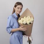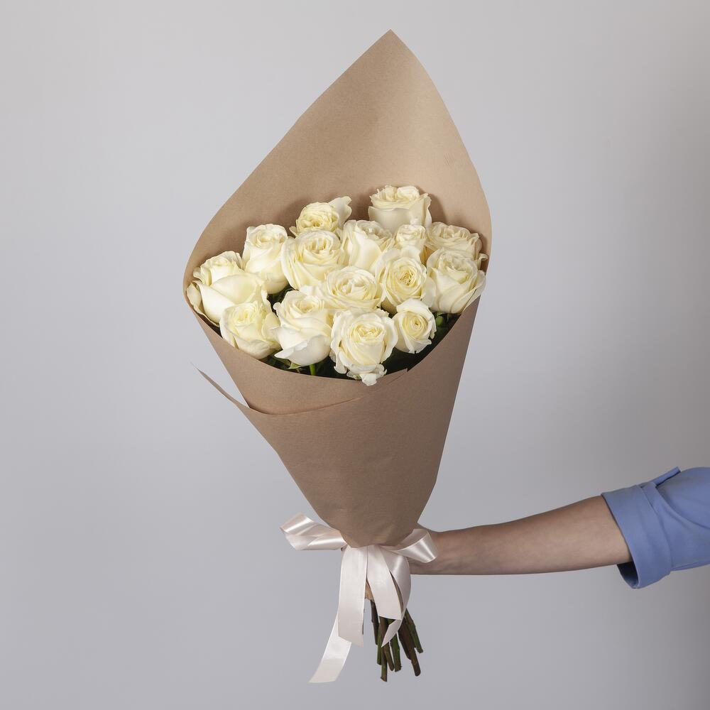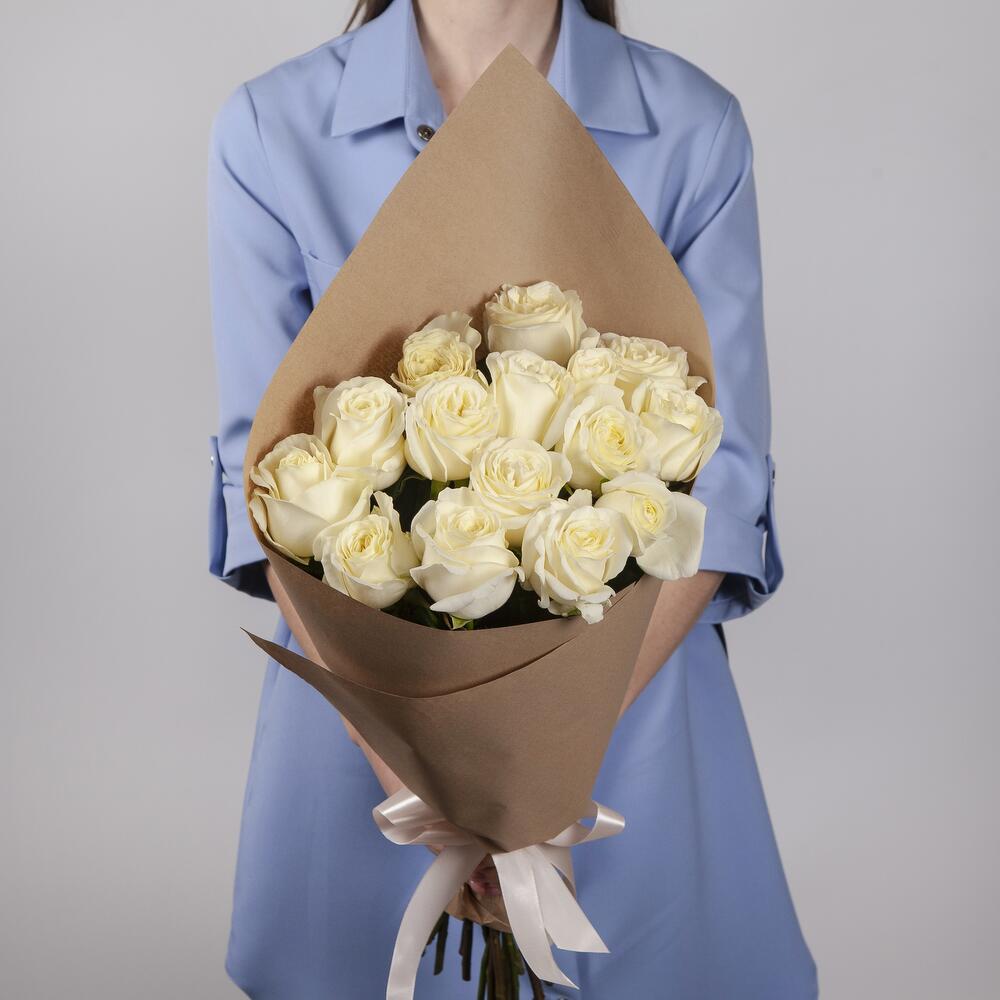 Лента атласная - 1 шт. Крафт упаковка - 1 шт. Роза белая россия 50 см - 15 шт.
