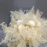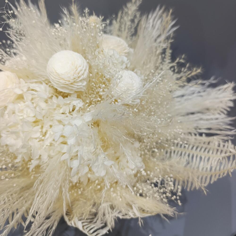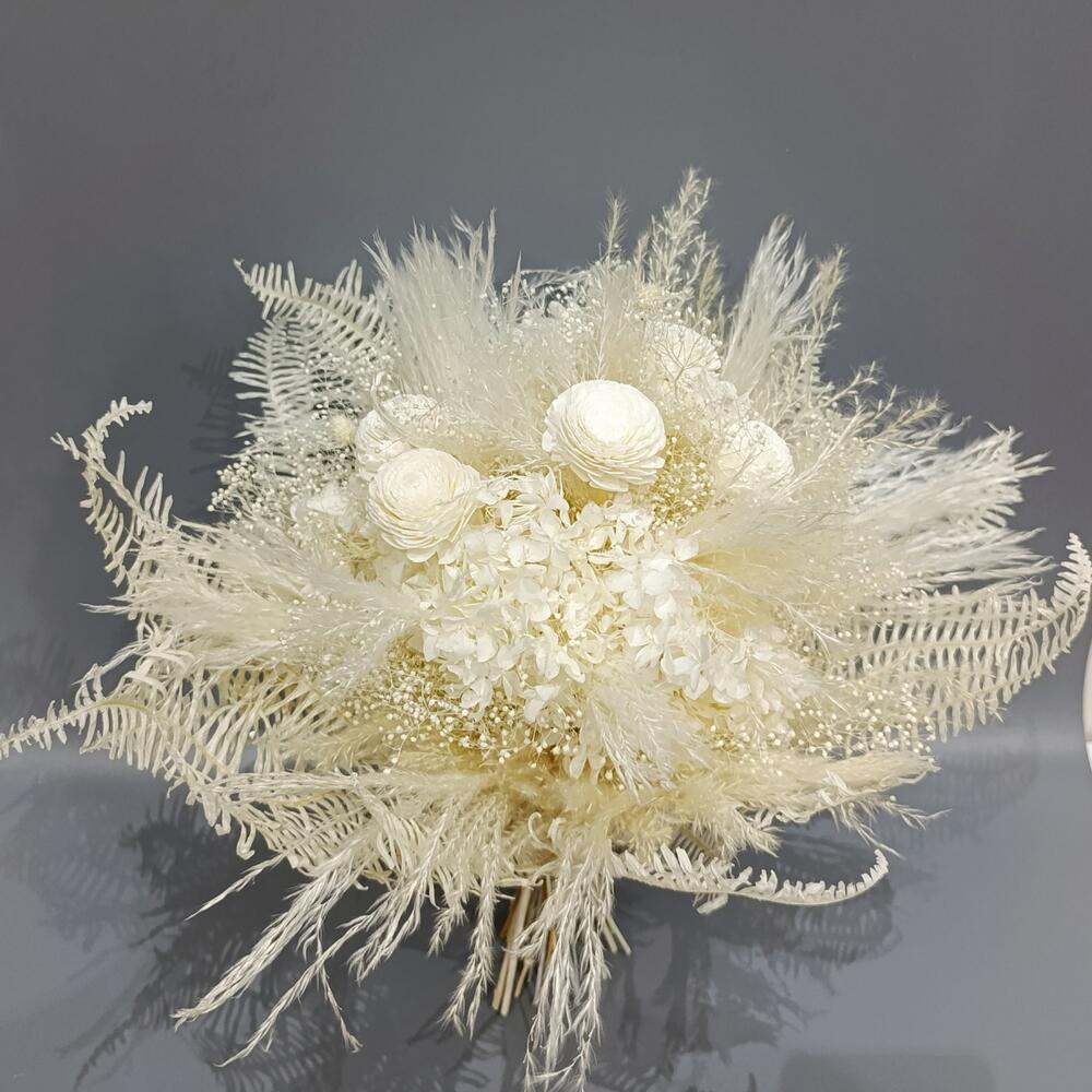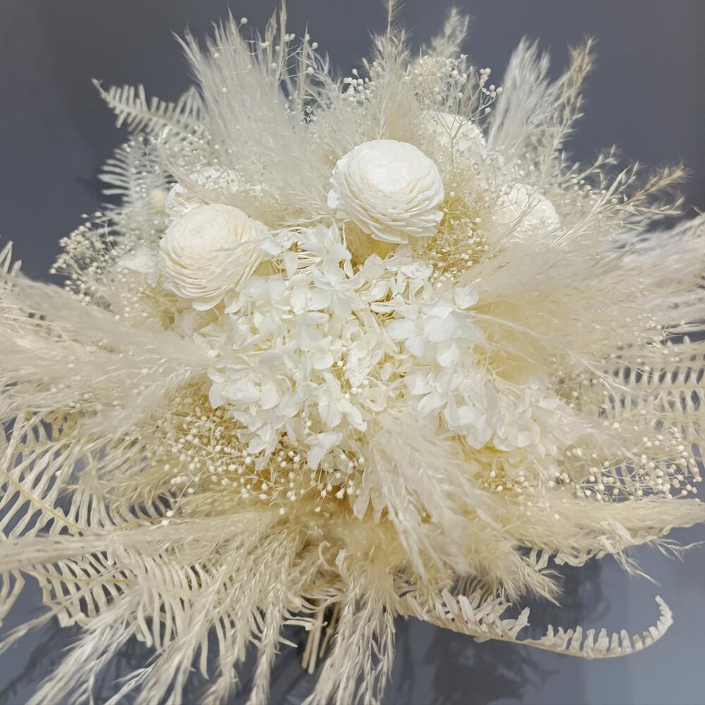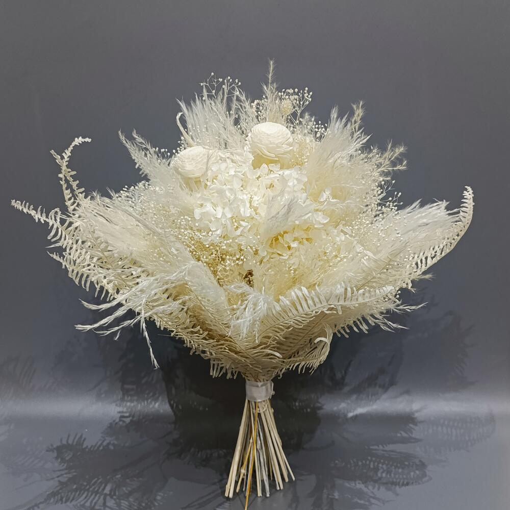 Гортензия - 1 шт. Папоротник - 5 шт. Лента атласная - 1 шт. Синеголовник - 2 шт. Нигелла - 3 шт. пампасная трава - 2 шт. каркас ручной работы - 1 шт.