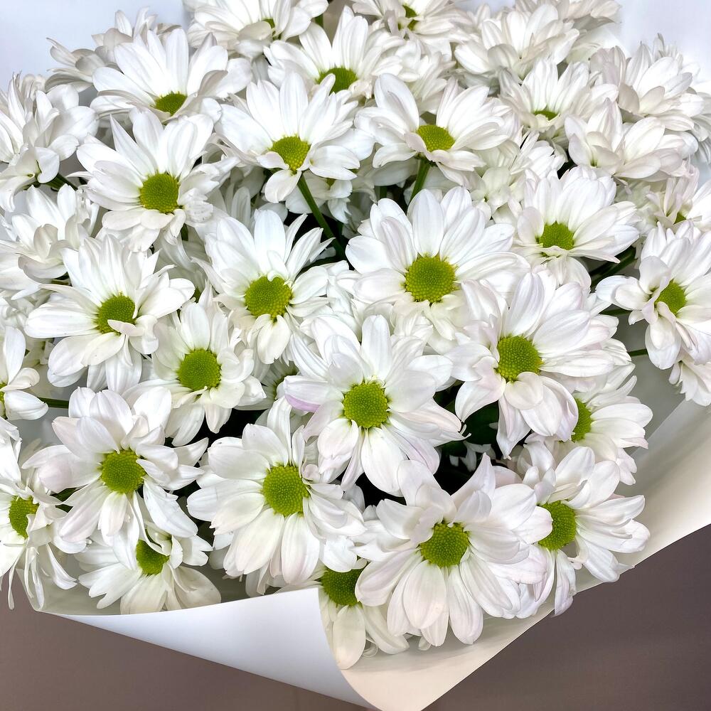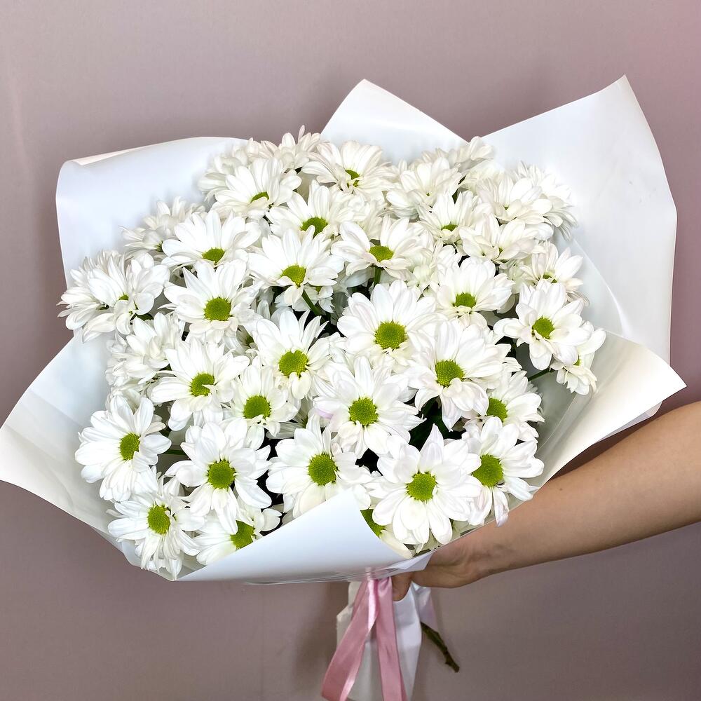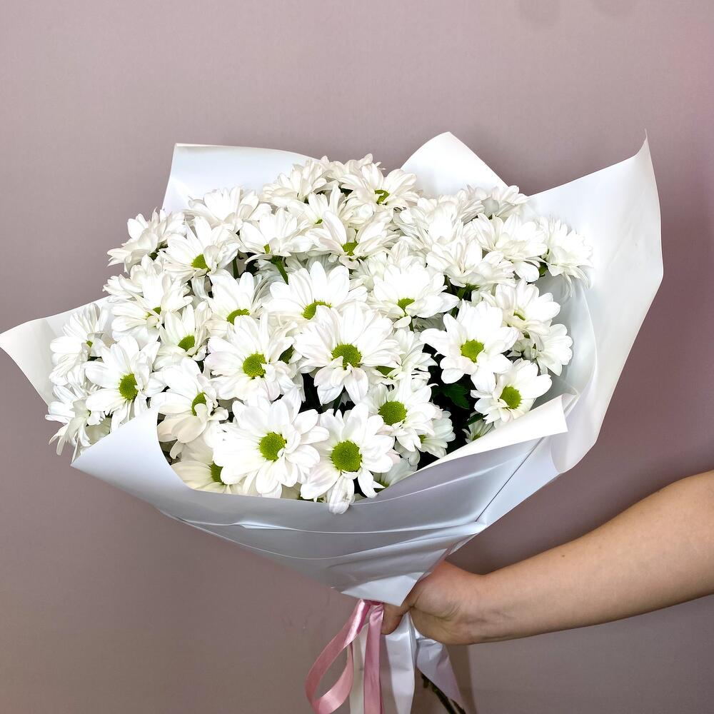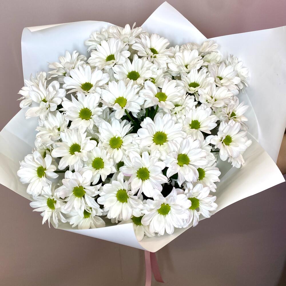 Букет белых ромашек. Нежный и стильный букет из семи кустовых хризантем представлен в элегантной упаковке. Каждый цветок благороден и изящен, создавая атмосферу уюта и радости. Идеальное решение для подарка любимому человеку или для создания уютного настроения в доме.