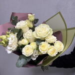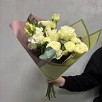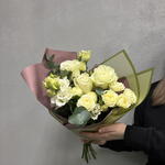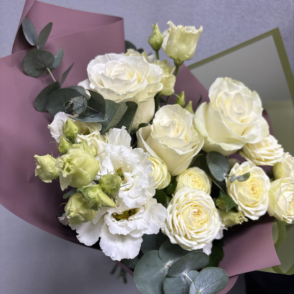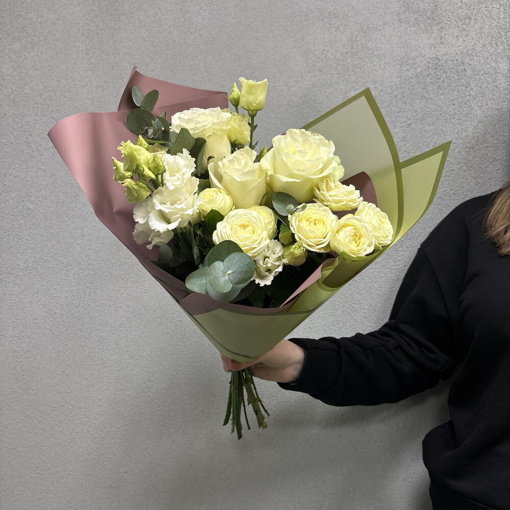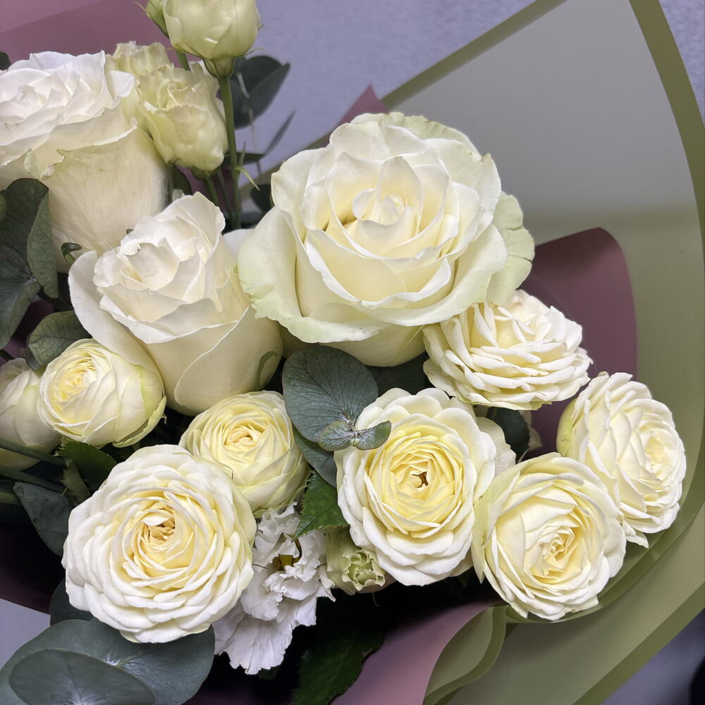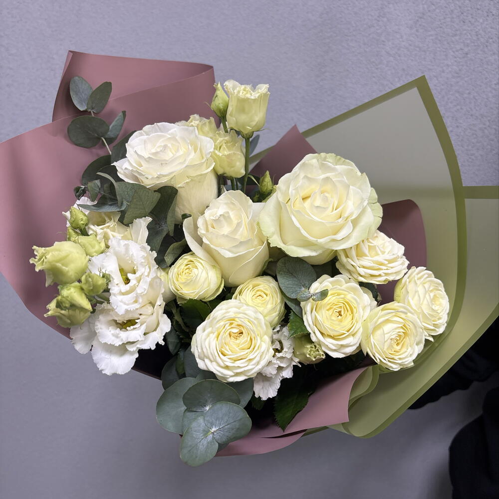Лента - 1 шт. Эвкалипт - 1 шт. Роза - 3 шт. Эустома - 2 шт. Пленка - 2 шт. Роза кустовая пионовидная - 2 шт.