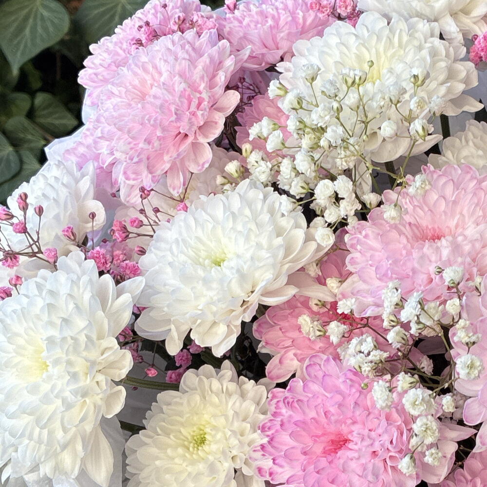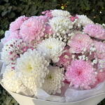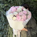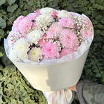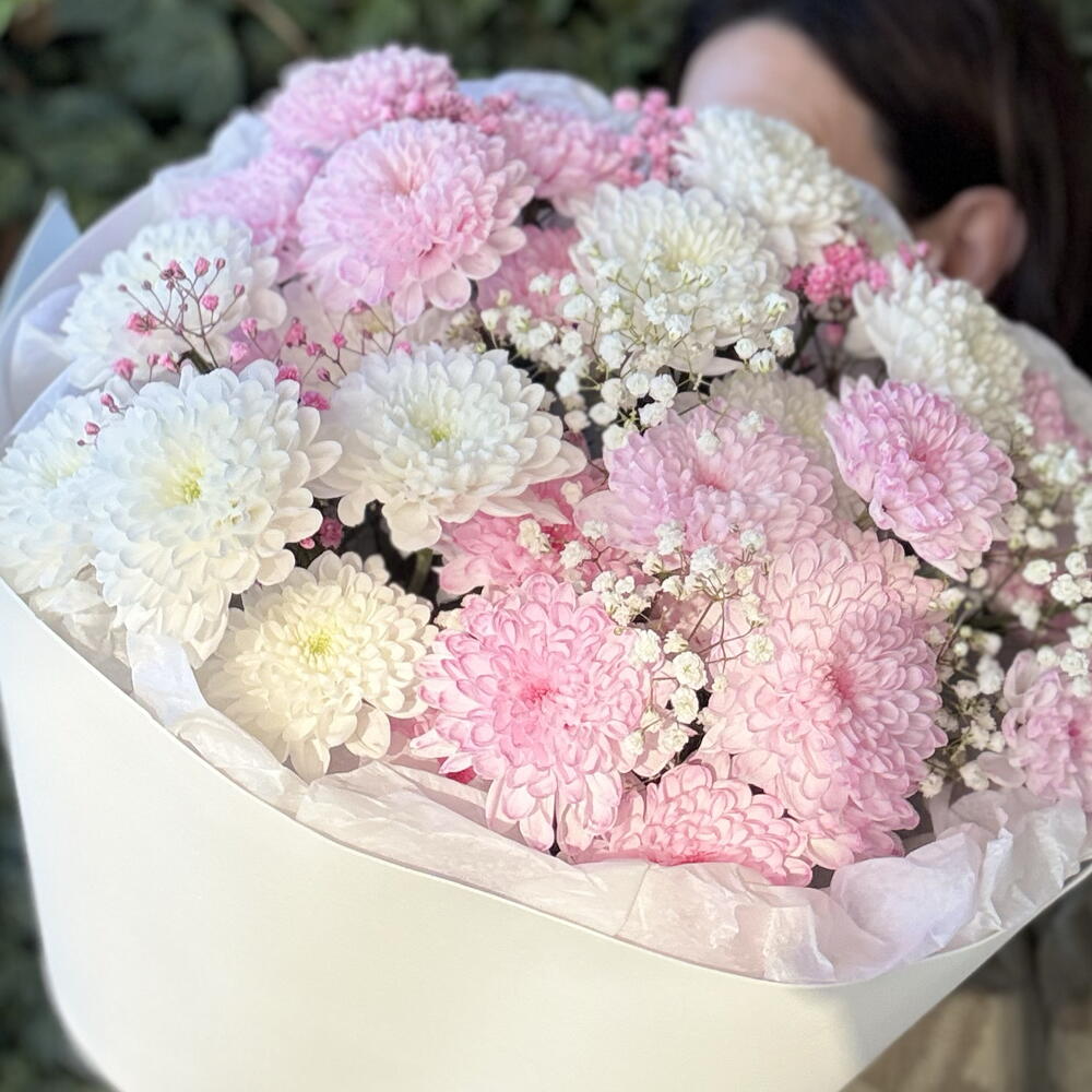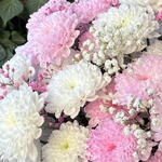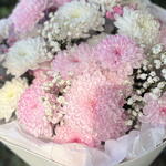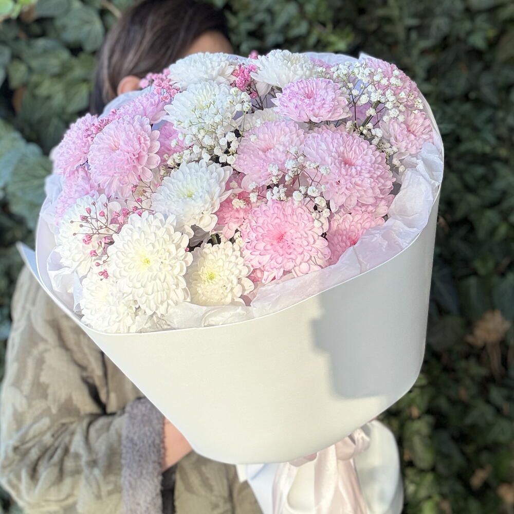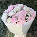 Букет из кустовой хризантемы сочетает белоснежные и нежные розовые оттенки, создавая чарующее зрелище. Белые и розовые хризантемы образуют плотные маленькие шапочки, расположенные близко друг к другу, формируя единое целое. Их формы напоминают кружево, тонкое и изящное, словно сотканное природой специально для вас. Гипсофила, белая и розовая, выступает тонким дополнением, даря композиции лёгкую прозрачность и воздушные акценты. Она деликатно заполняет пространство между хризантемами, позволяя цвету плавно переходить от одного оттенка к другому. Белая упаковка играет роль фона, поддерживающего гармонию букета, подчёркивая его чистоту и спокойствие. Для мамы, мама, мамуле, мамуля, мамочке, мамочка, матери, мать,mama,mam