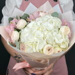 Идеальный подарок для Мамы. Авторский букет из белой Гортензии , нежно-розовых кустовых Роз Мэнсфилд Парк и розовой Альстромерии с Эвкалиптом в стильной упаковке. матери