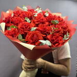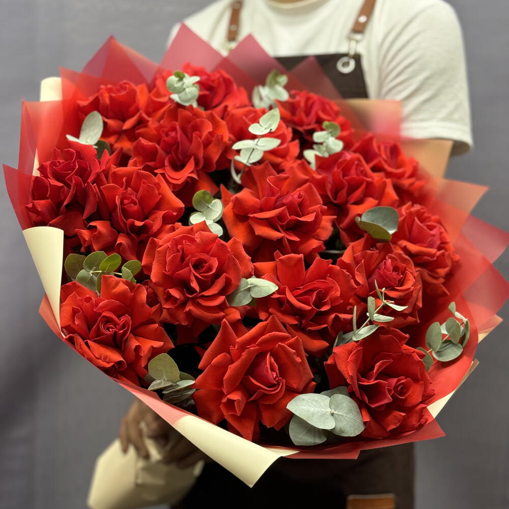 Эвкалипт - 10 шт. Лента атласная - 1 шт. Упаковка дизайнерская - 9 шт. Французская роза - 17 шт. любовь флориста (бесплатно) - 1 шт.