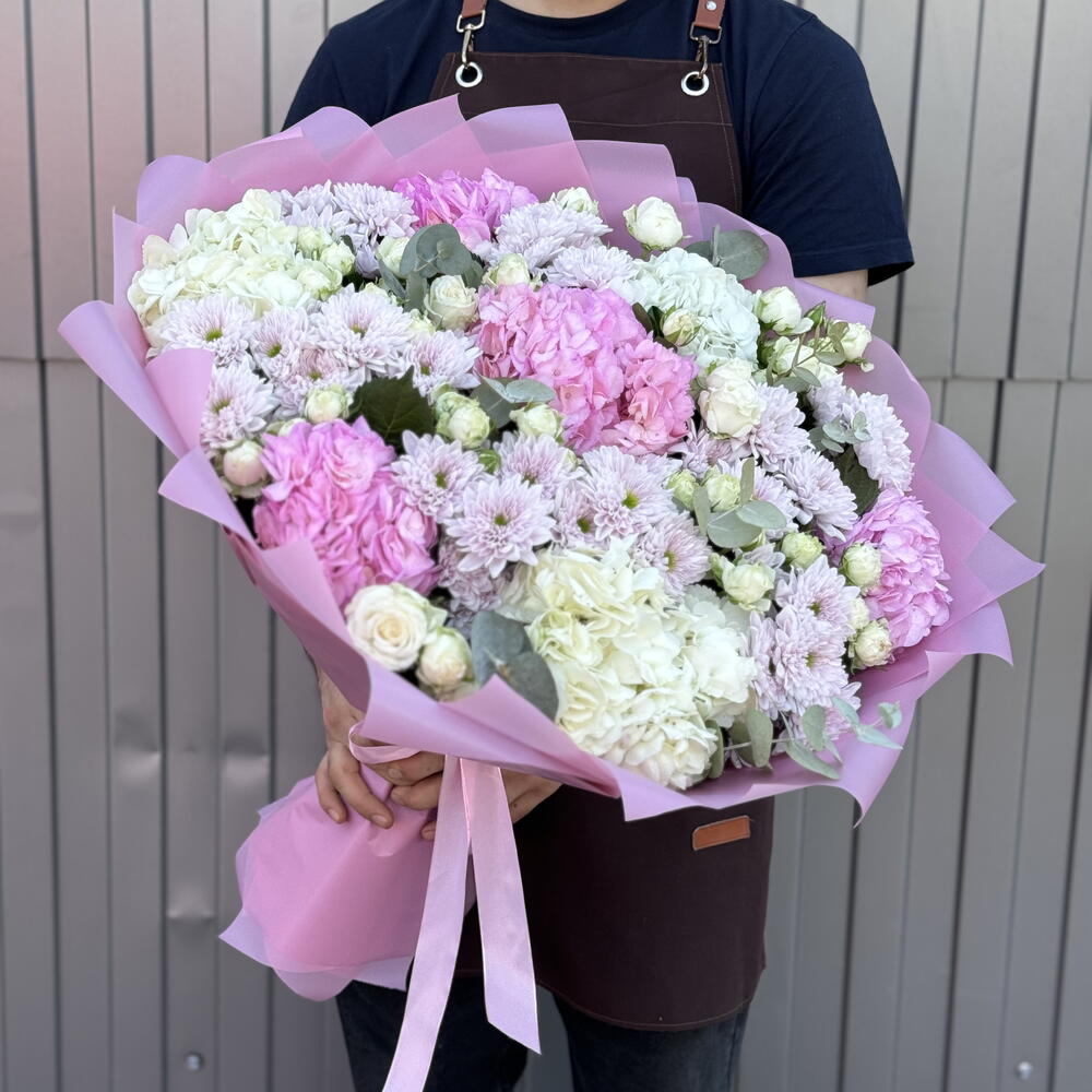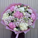 Гортензия - 7 шт. Эвкалипт - 7 шт. Кустовая хризантема - 10 шт. Лента атласная - 1 шт. Упаковка дизайнерская - 9 шт. Кустовая роза пионовидная - 10 шт.