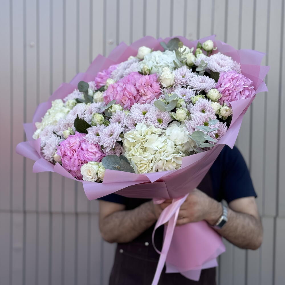Гортензия - 7 шт. Эвкалипт - 7 шт. Кустовая хризантема - 10 шт. Лента атласная - 1 шт. Роза пионовидная - 10 шт. Упаковка дизайнерская - 9 шт.