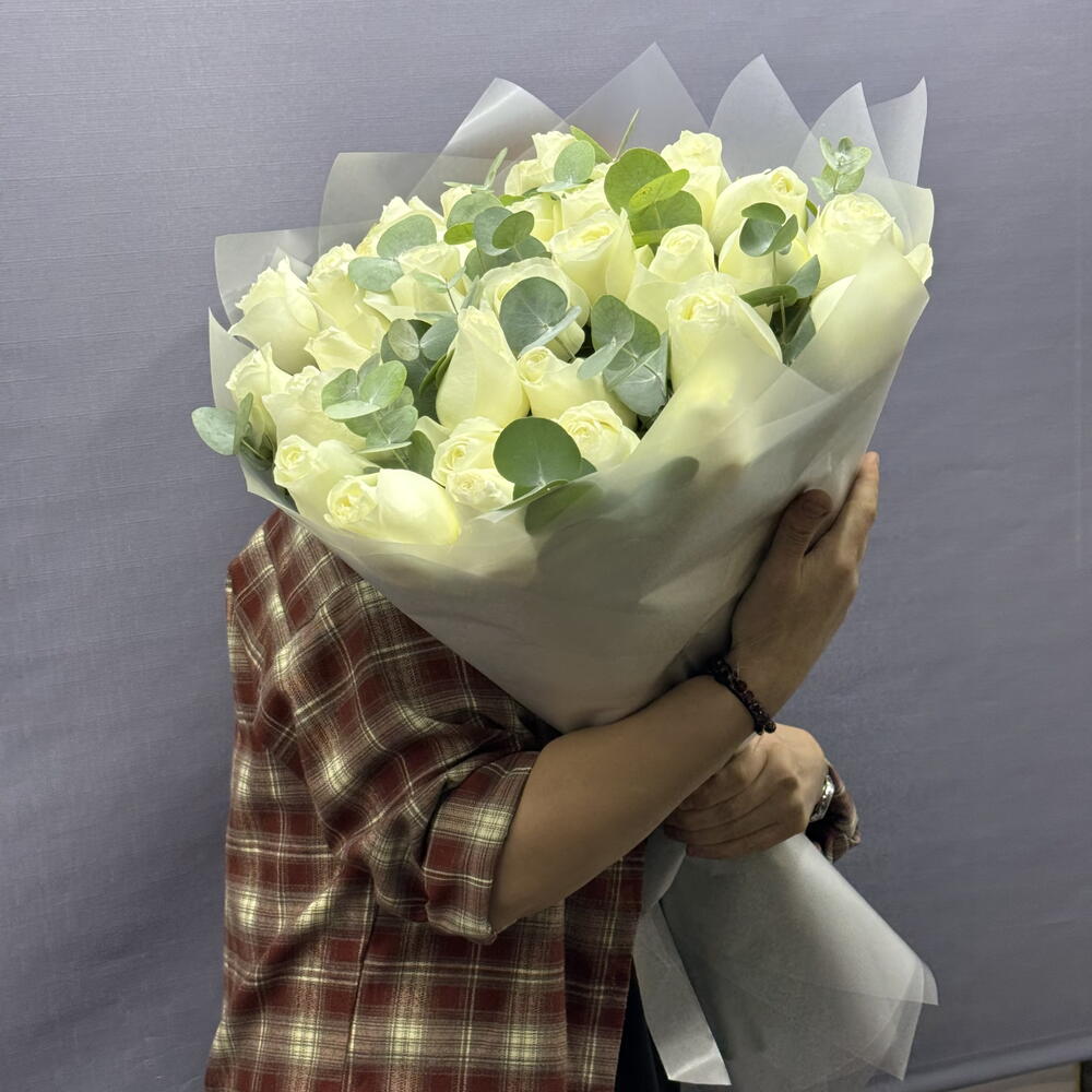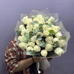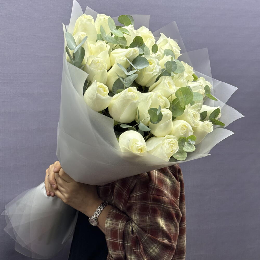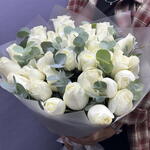 Эвкалипт - 10 шт. Роза - 35 шт. Лента атласная - 1 шт. Матовая упаковка - 9 шт.