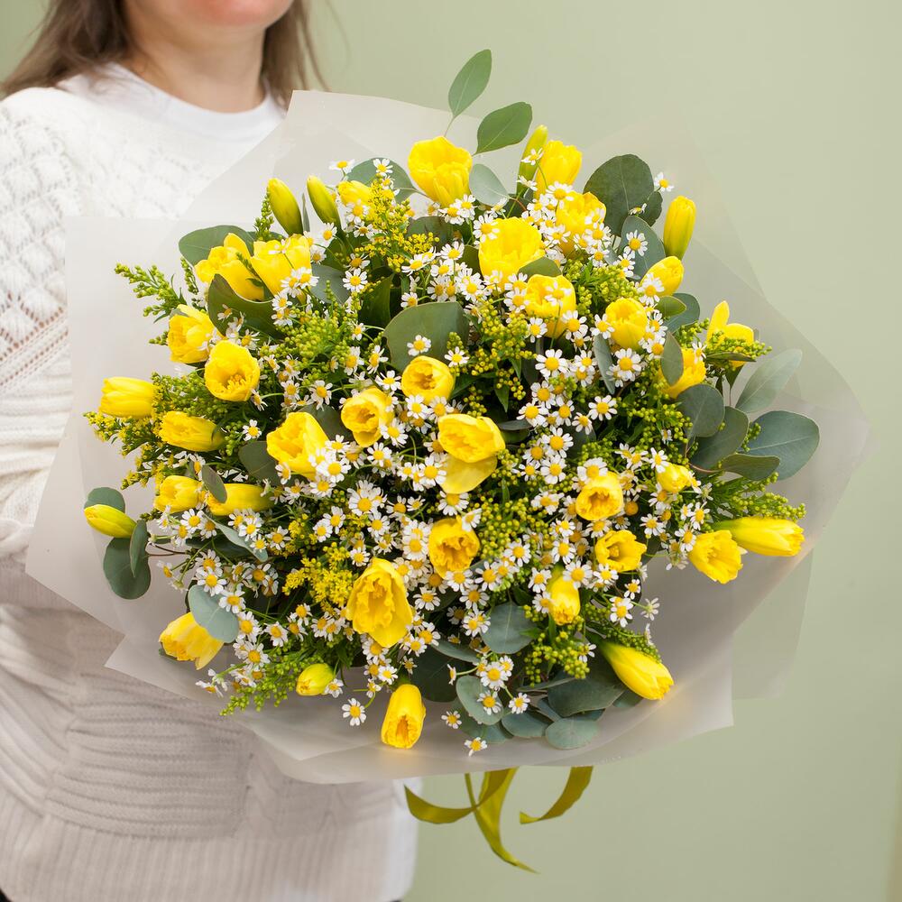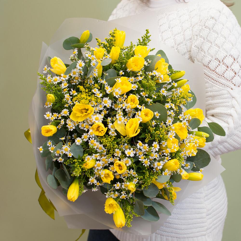 Букет цветов в желтых тонах из нарциссов, ромашек, солидаги с эвкалиптом в дизайнерской упаковке. Очень красивый букет для подарка ко всем весеним праздникам, так же получателем подарка может быть любой человек.