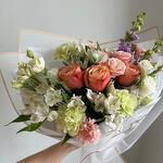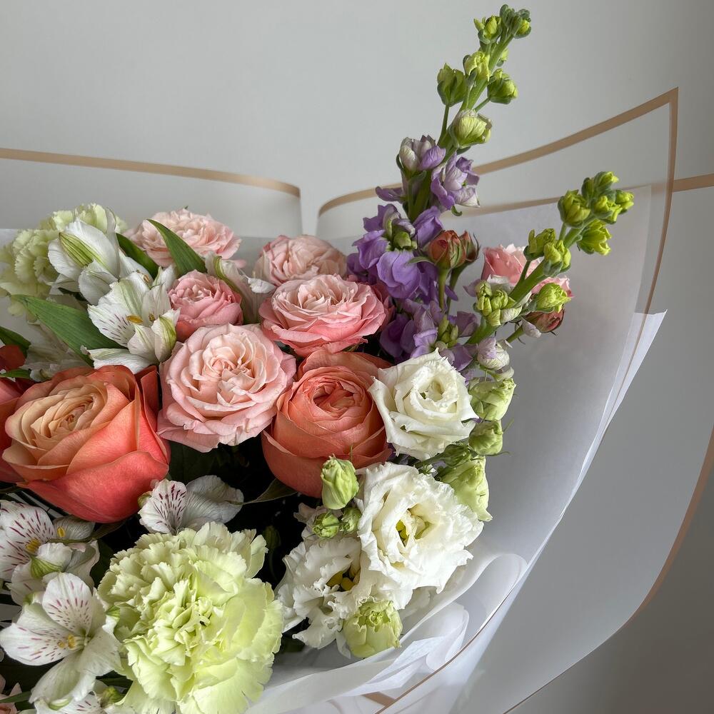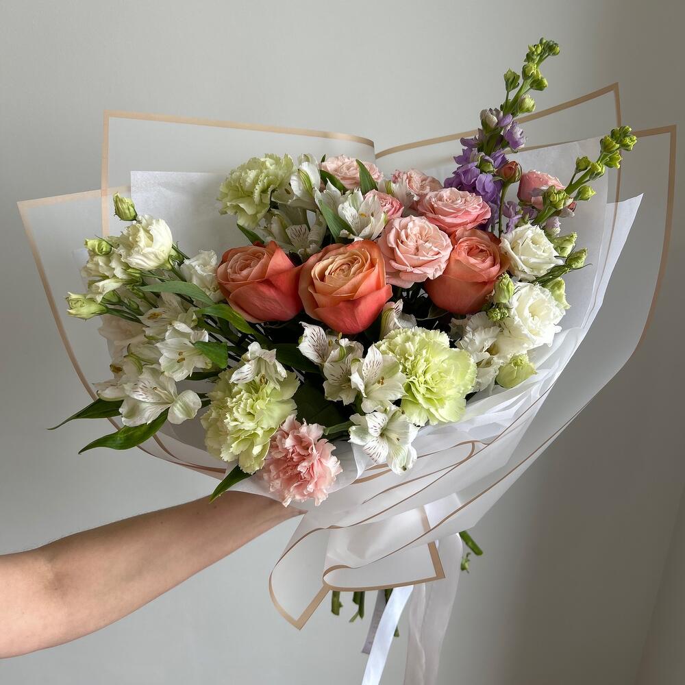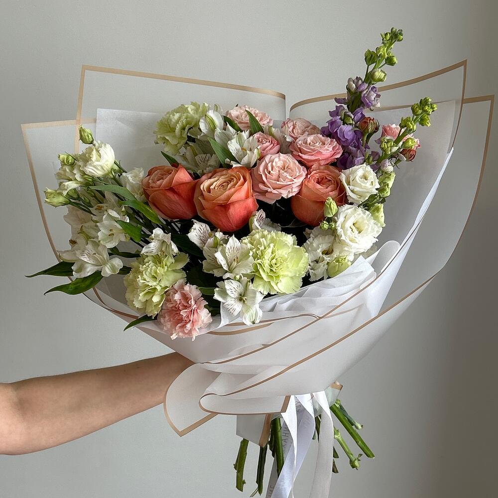 Альстромерия - 3 шт. Маттиола - 2 шт. Роза кустовая - 1 шт. Роза - 3 шт. Эустома - 2 шт. Диантус - 4 шт.