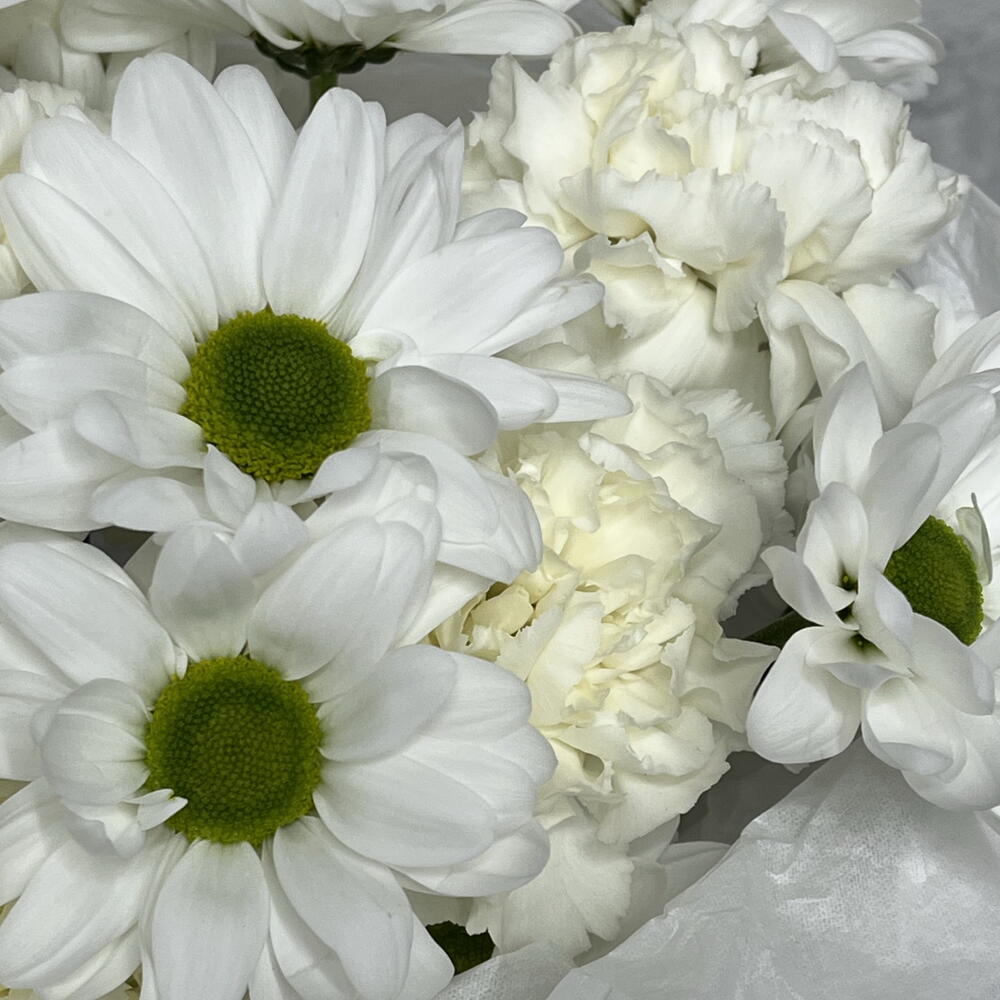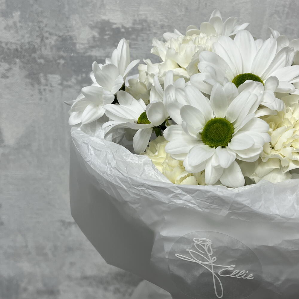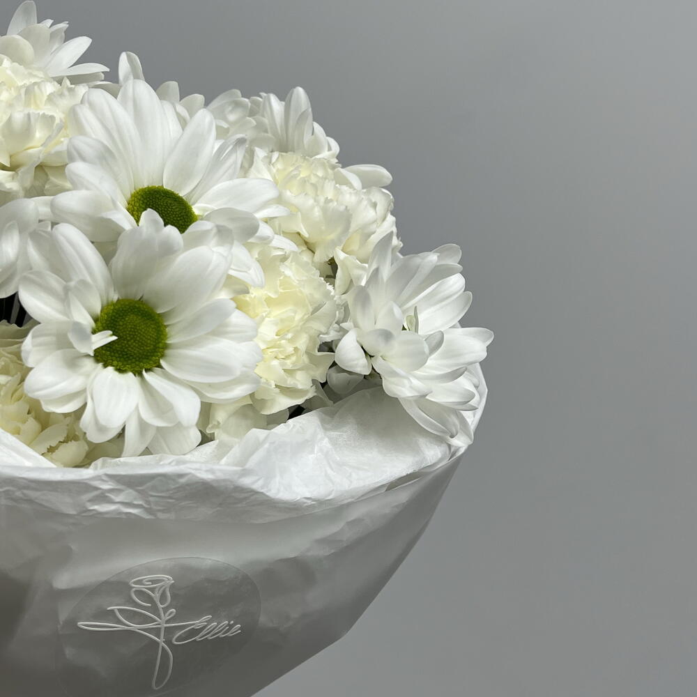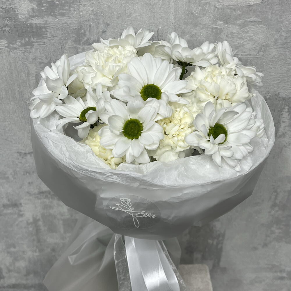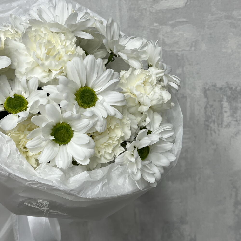 Кустовая хризантема - 2 шт. Лента атласная - 1 шт. Диантус - 7 шт. Бумага тишью - 1 шт. бумага дизайнерская - 1 шт.