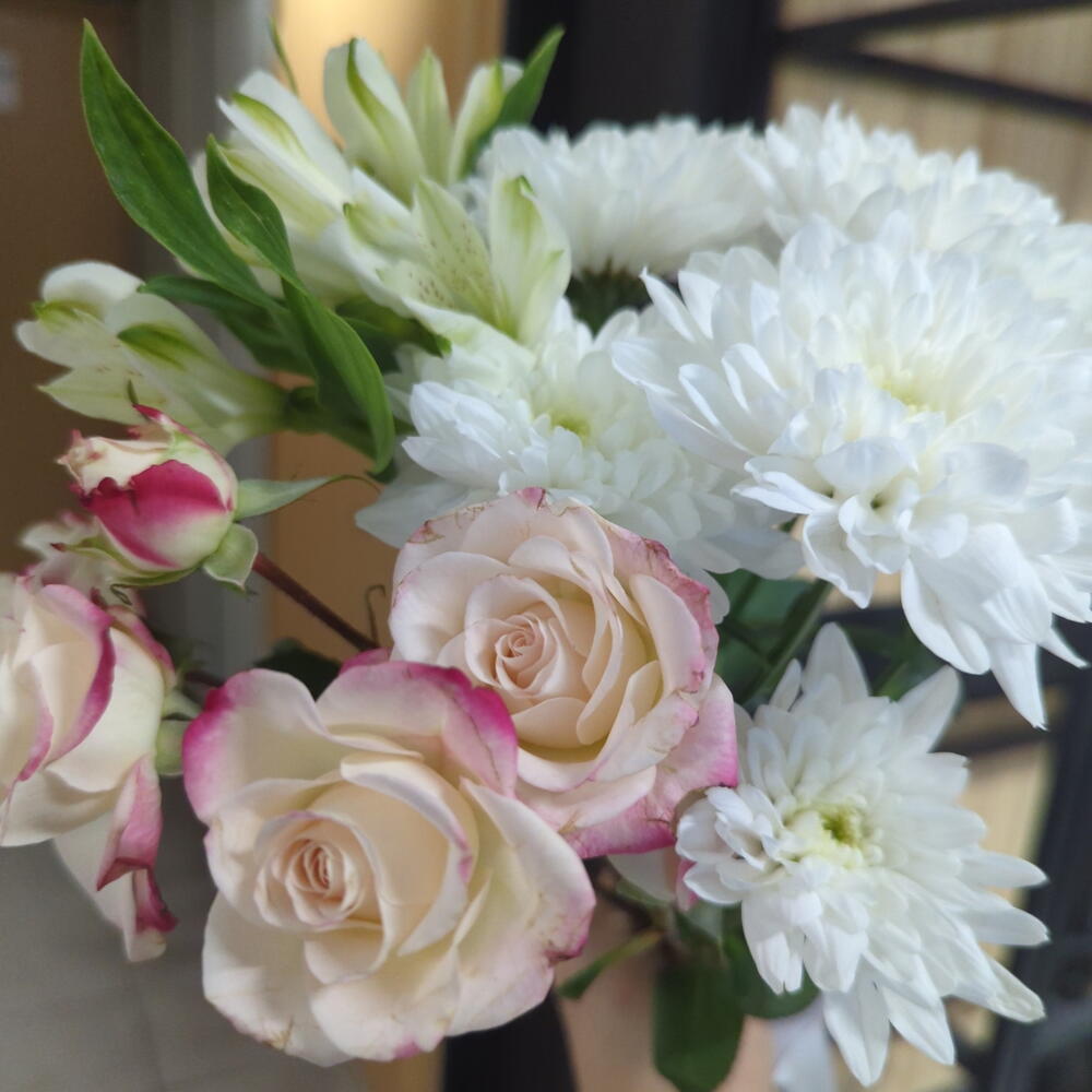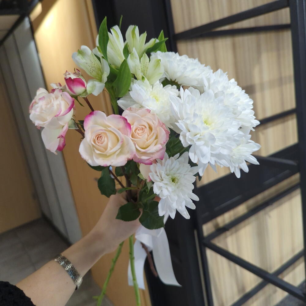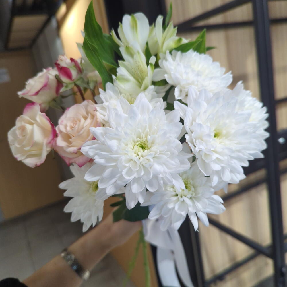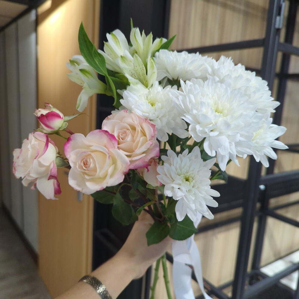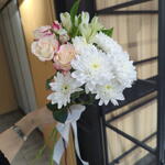 Альстромерия - 1 шт. Хризантема кустовая - 1 шт. Кустовая роза - 1 шт. Атласная лента - 1 шт.