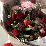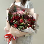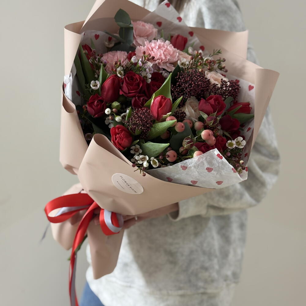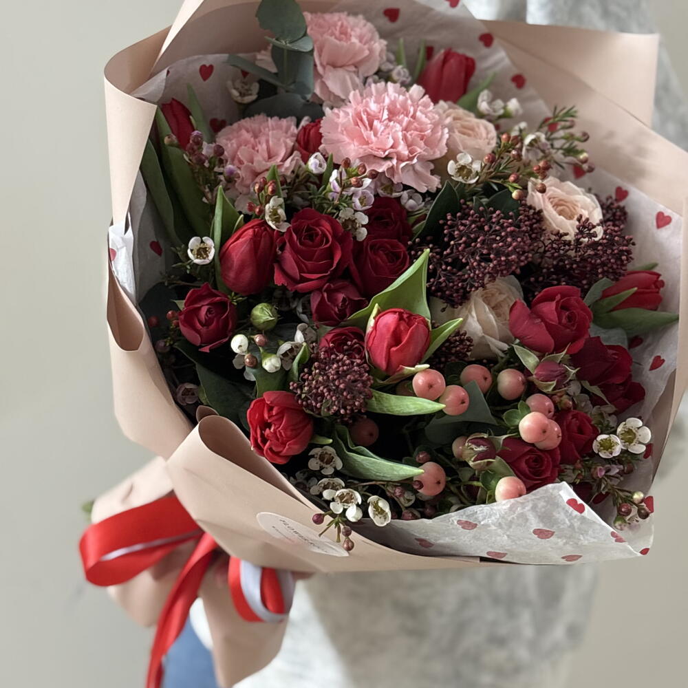 Гиперикум - 1 шт. Лента атласная - 2 шт. Роза пионовидная кустовая - 1 шт. Хамелациум - 2 шт. Роза кустовая красная - 3 шт. Тюльпан пионовидный - 7 шт. Гвоздика цветная - 3 шт. Пленка матовая - 2 шт. скиммия красная (Rubella) - 2 шт. Эвкалипт Цинерея - 4 шт.